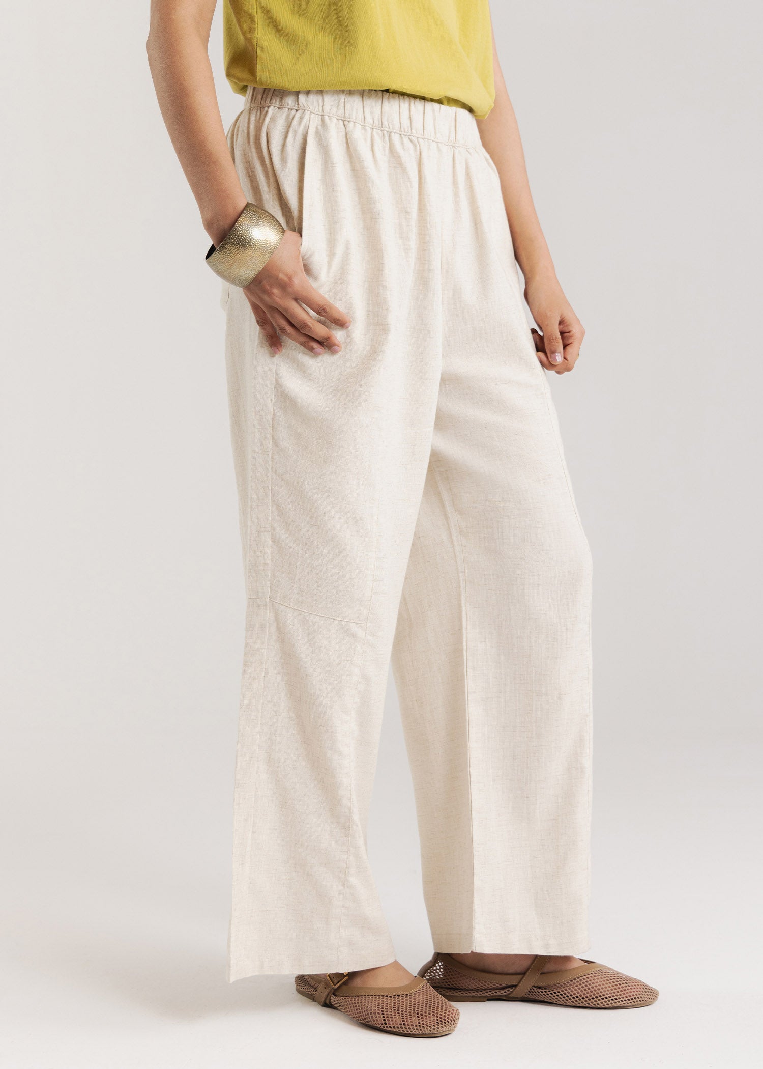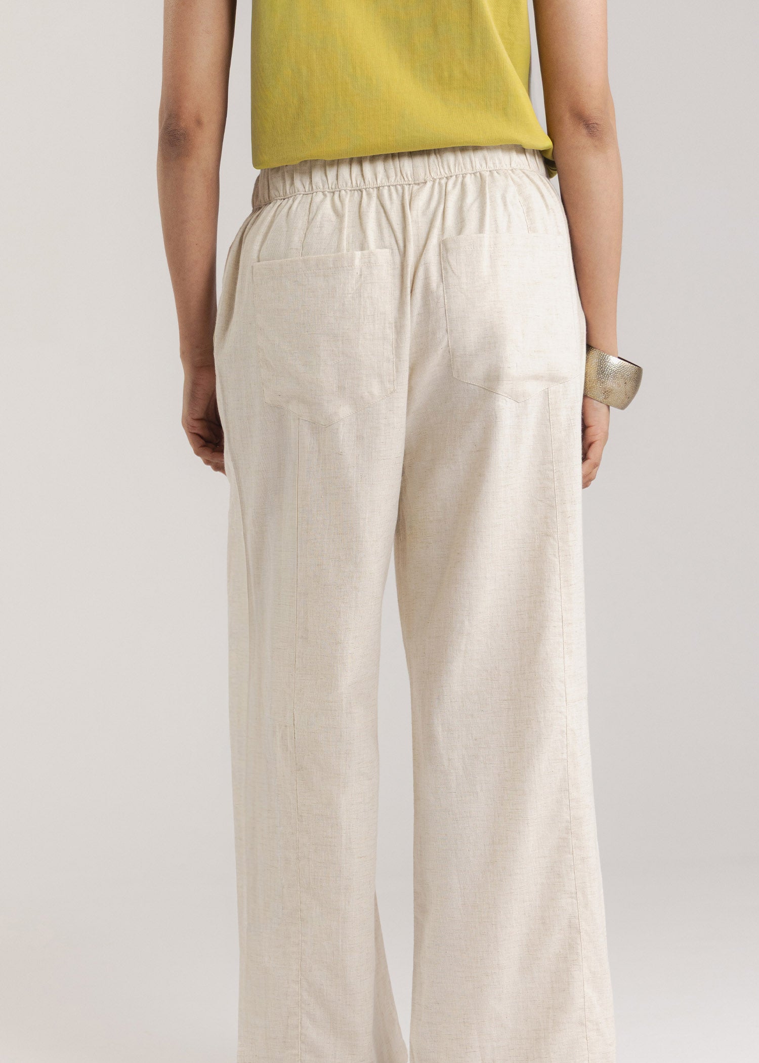 Tapered pant with elastic waistband, front seam with front side pockets and back pockets.