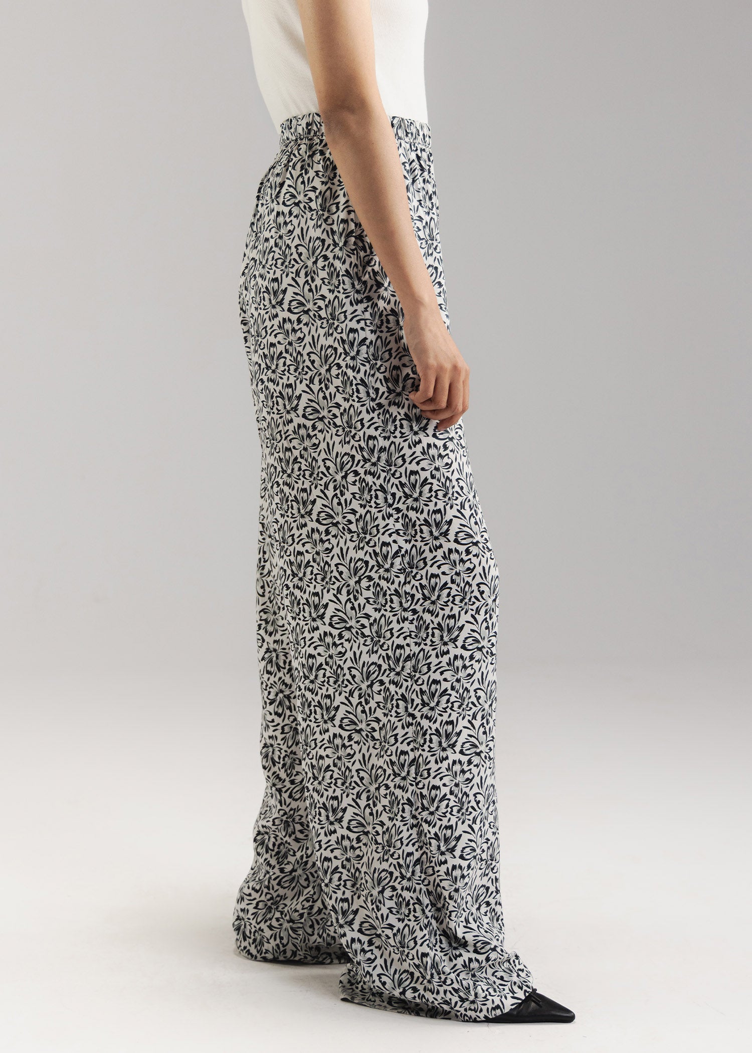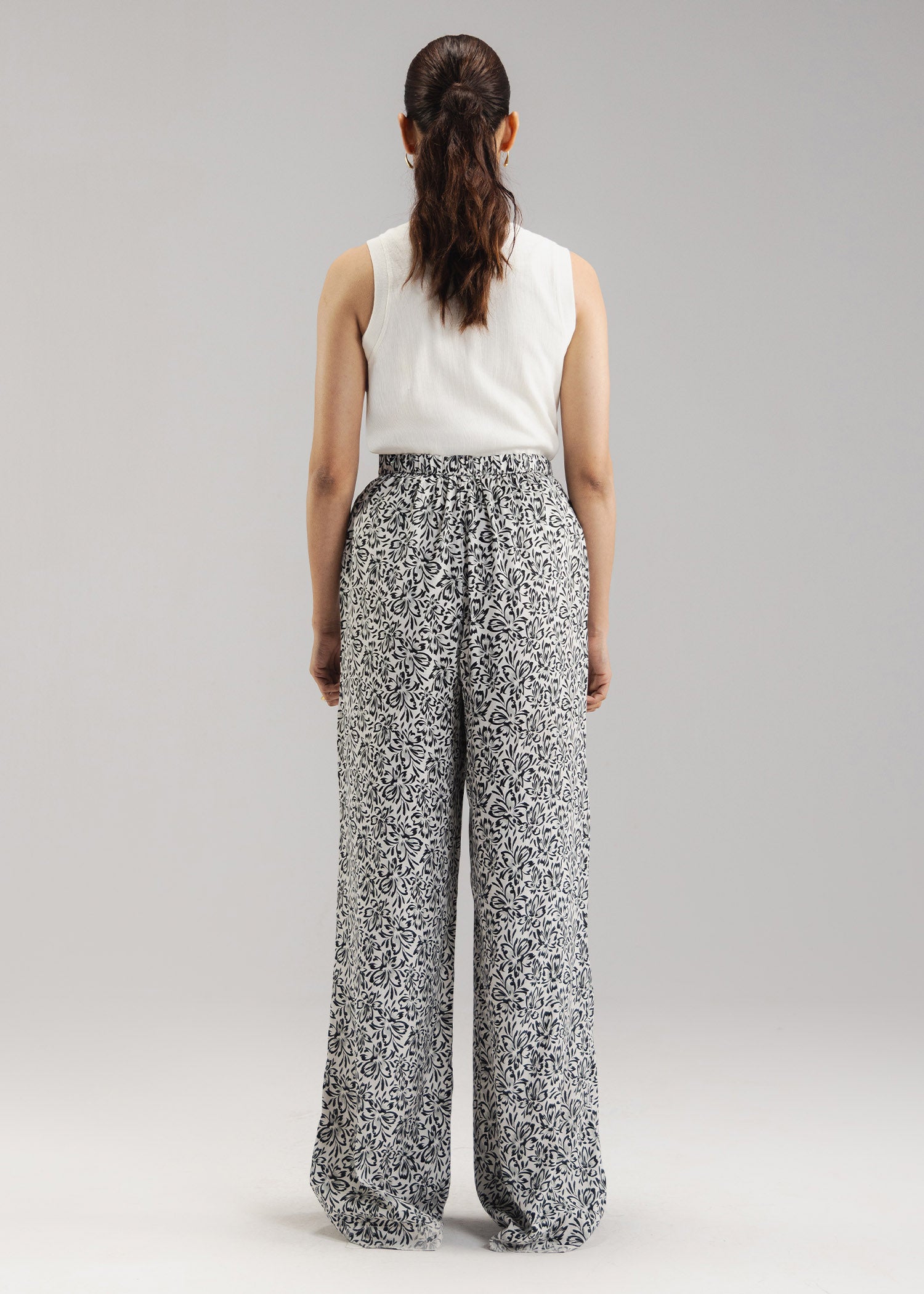Printed wide leg trouser with front side pockets and elastic waistband