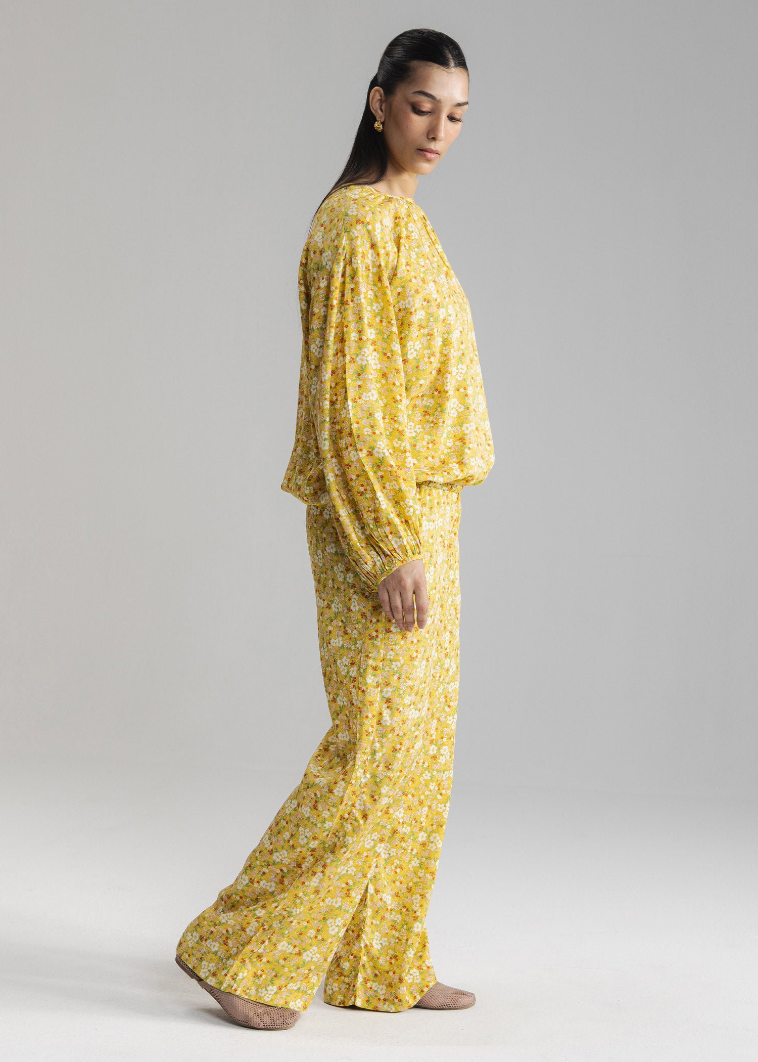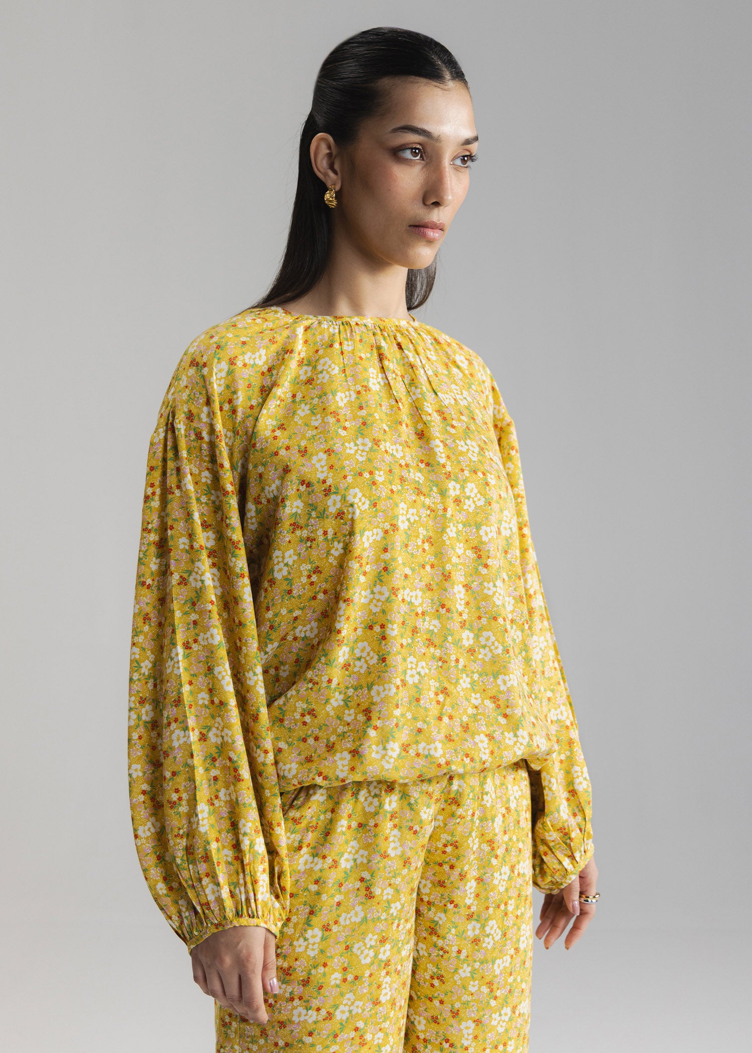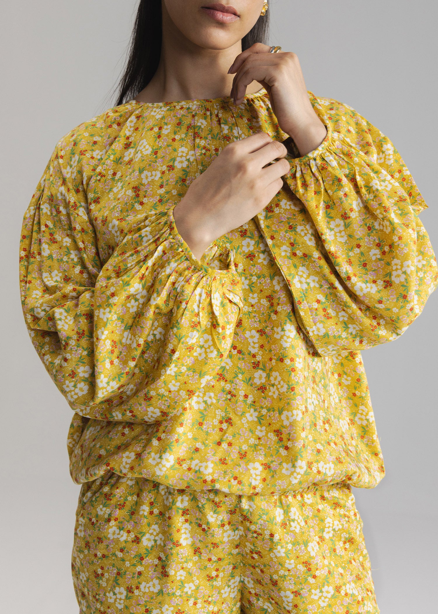 Printed blouse with crew neck with gathers. long puff sleeves and elastic hem. Includes button closure at back