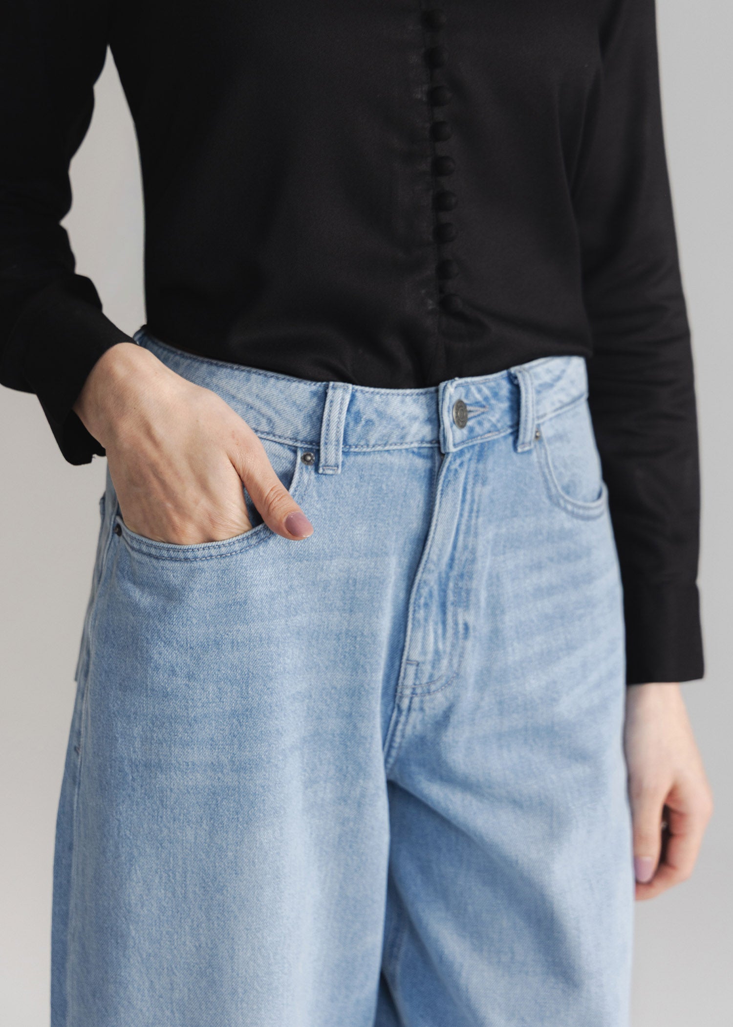 Light blue denim with a high-rise waist, Belt Loops and basic 5 pockets. Zip fly and metal button fastening.