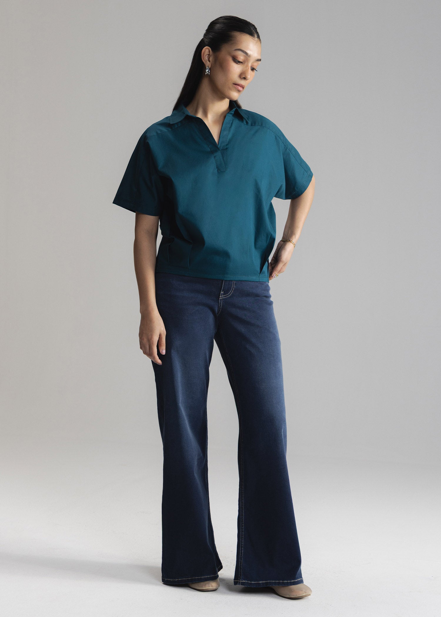Indigo denim with a high-rise waist and side pockets. Zip fly and horn button fastening.