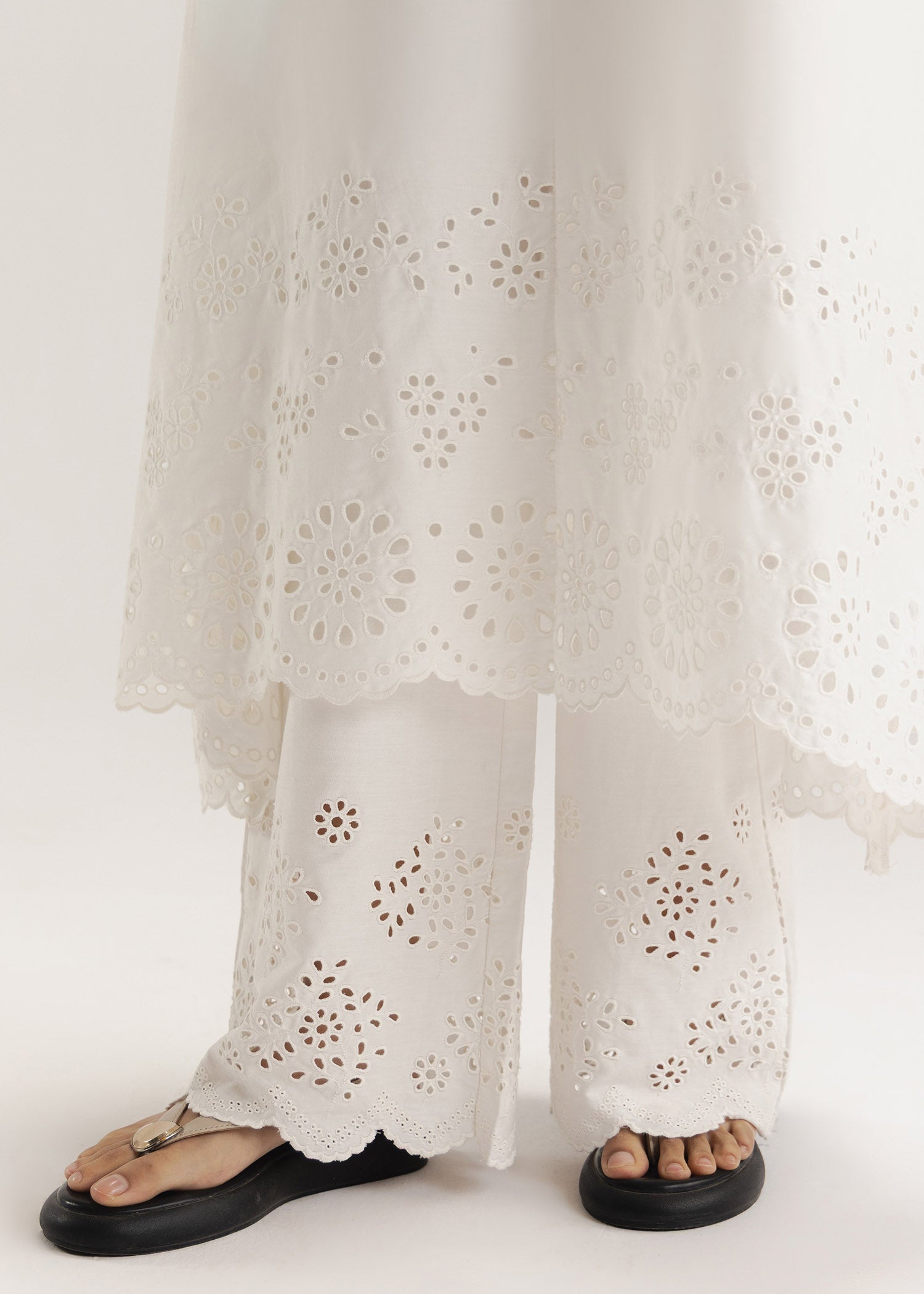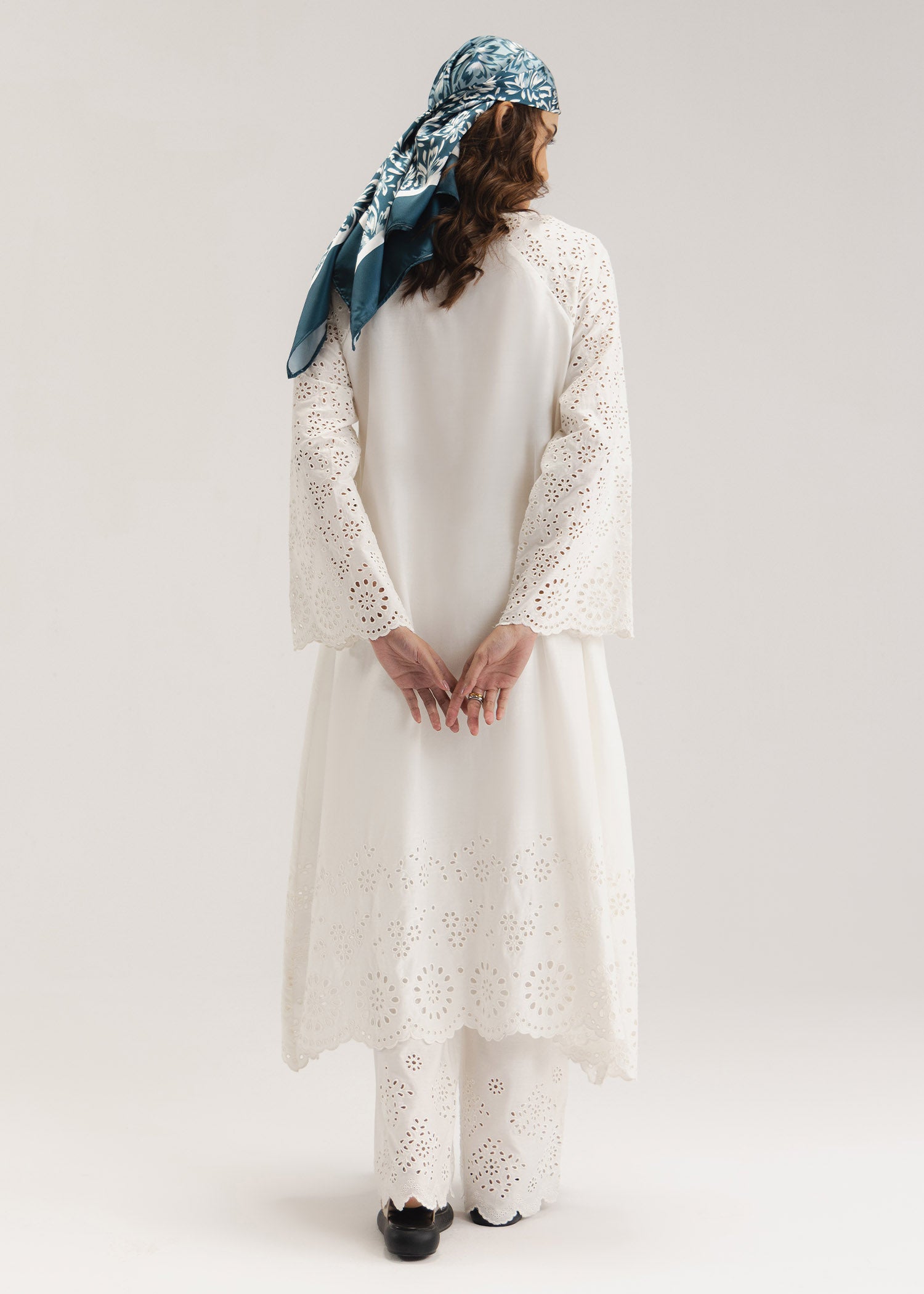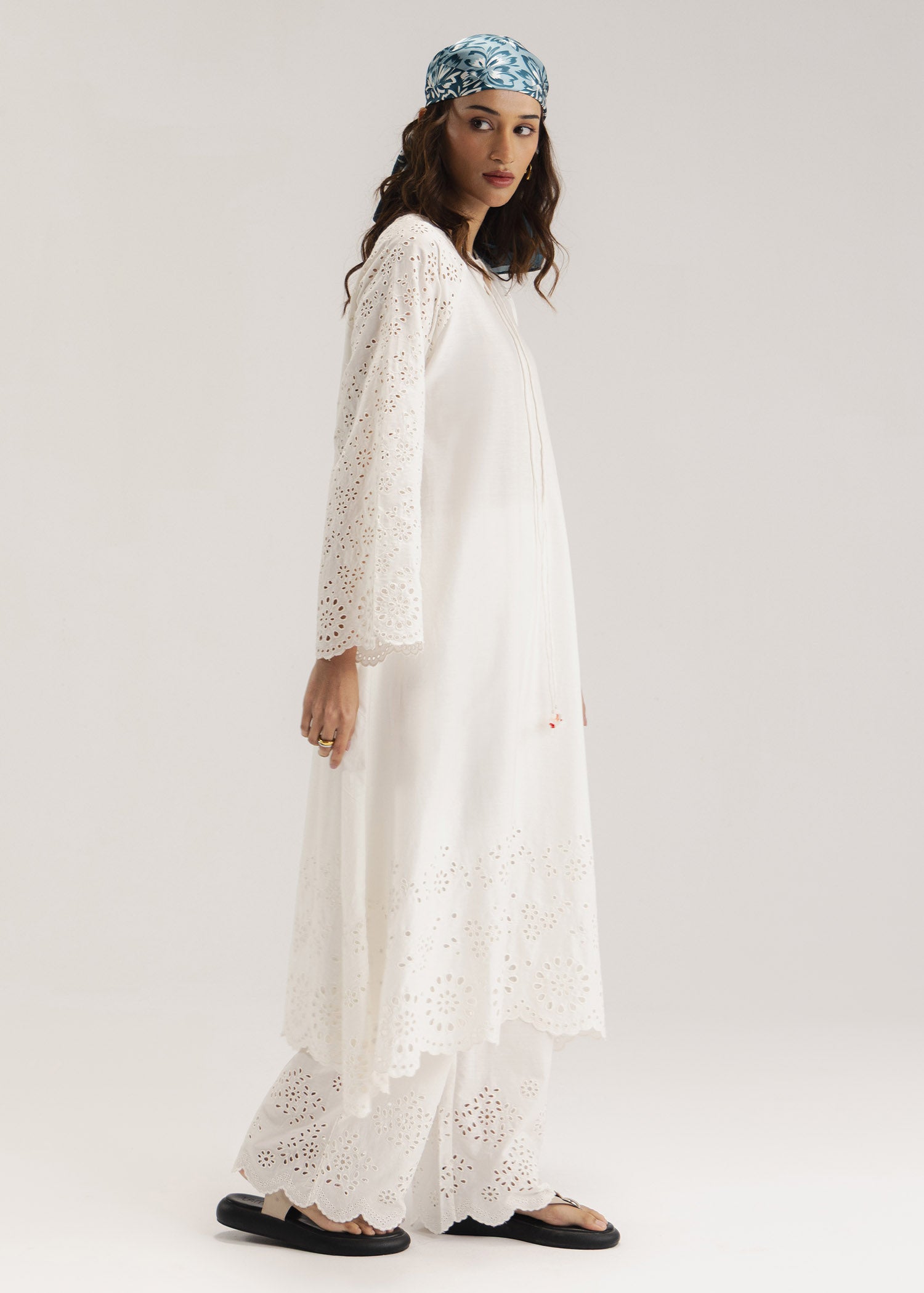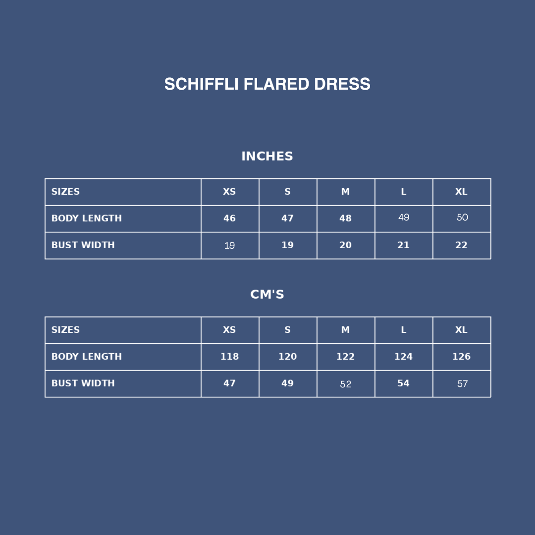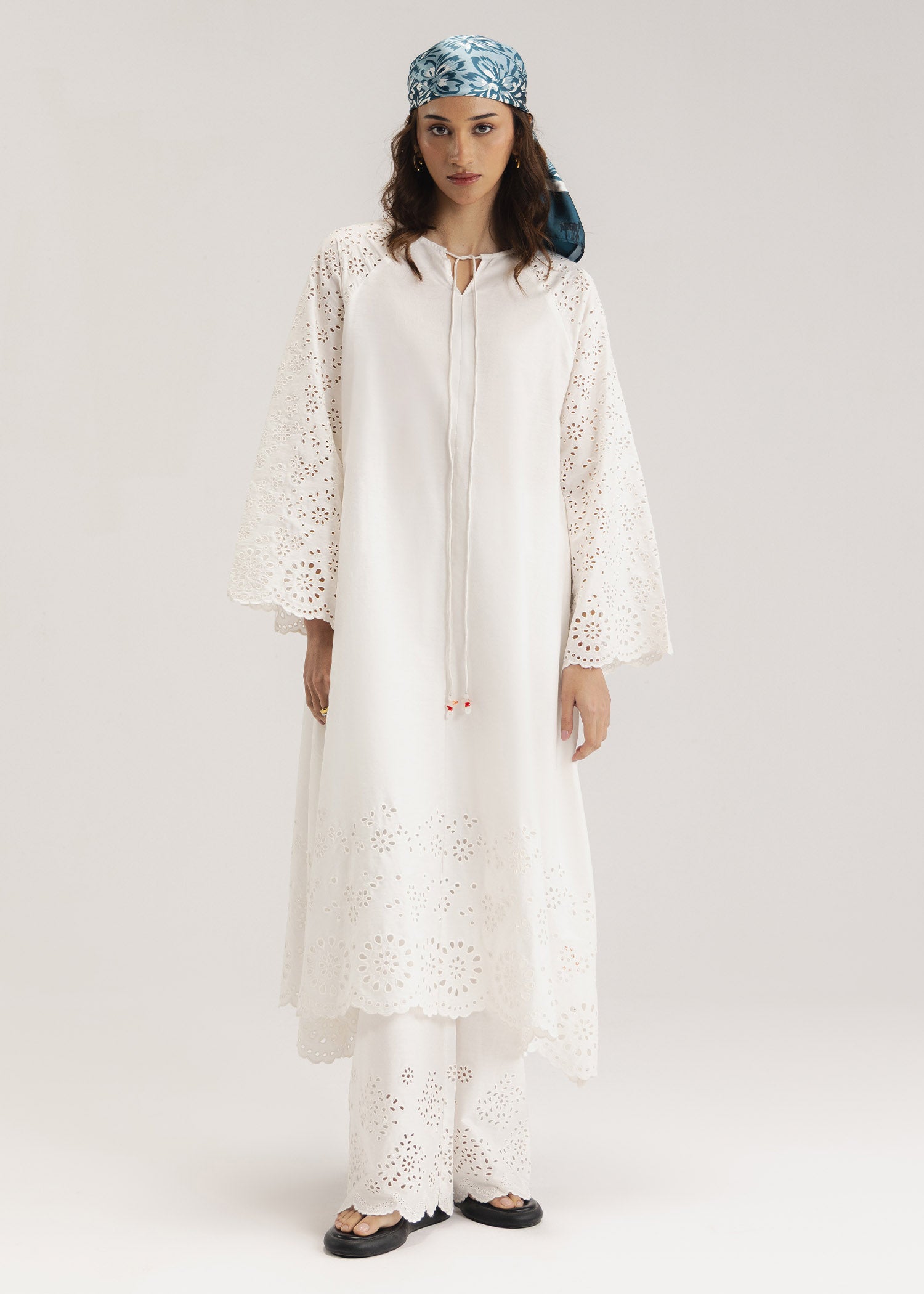 Flared dress with schiffli embroidery raglan sleeves and hem, round neck with v. includes drawstring with beads tassel