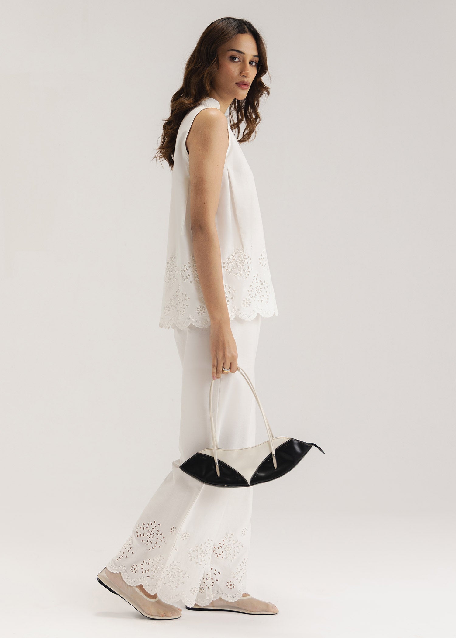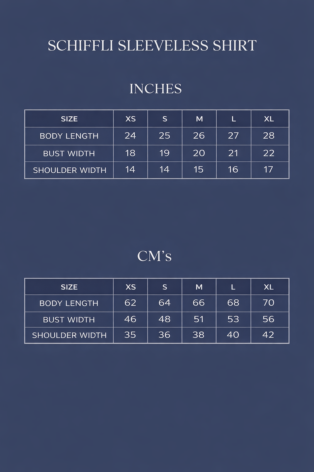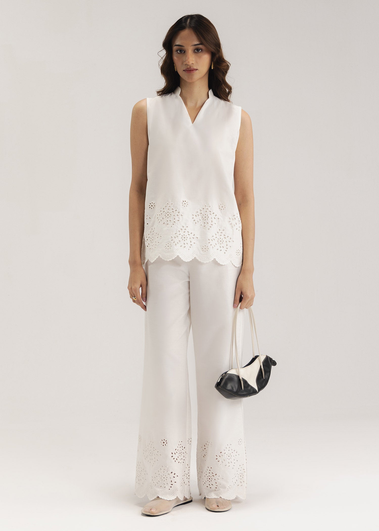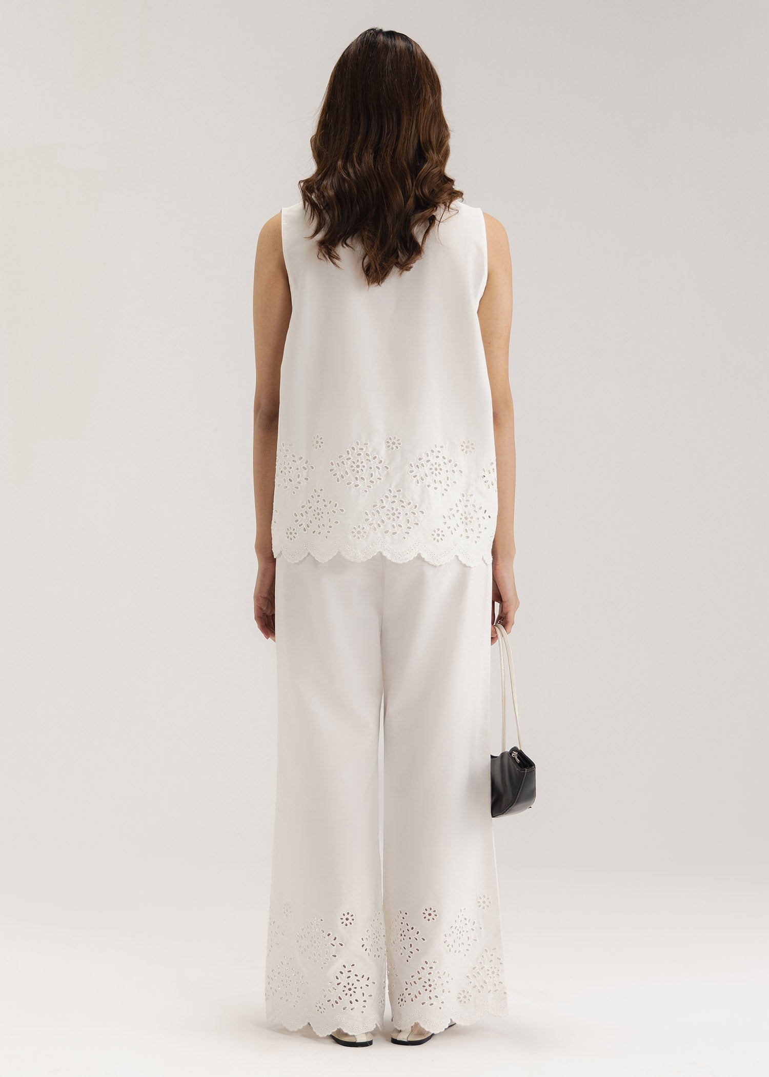 Sleeveless shirt with schiffli embroidery, pleats at front and V-neck with band collar.