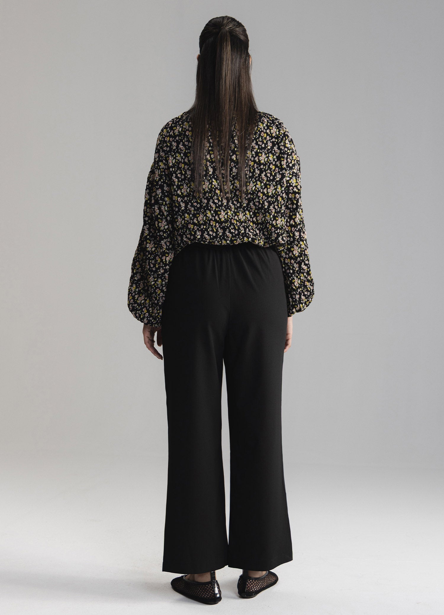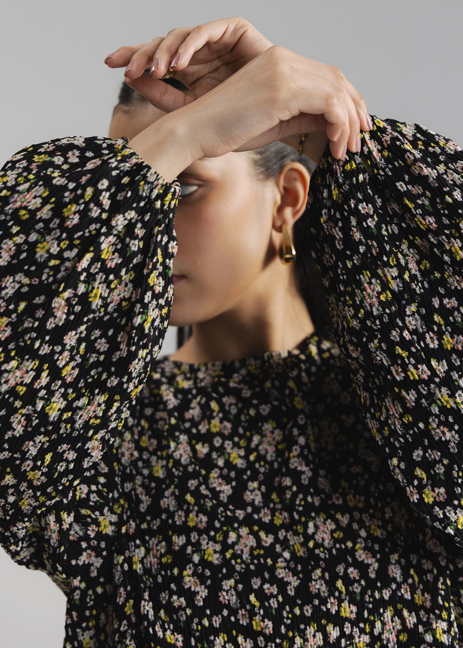Printed crinkle top in crew neck and long puff sleeves with elastic hem. Includes button closure at back