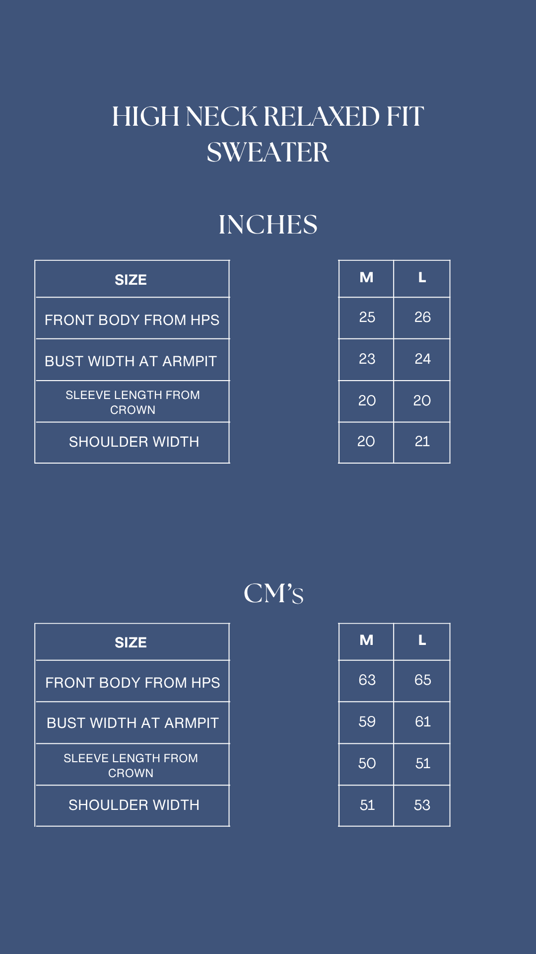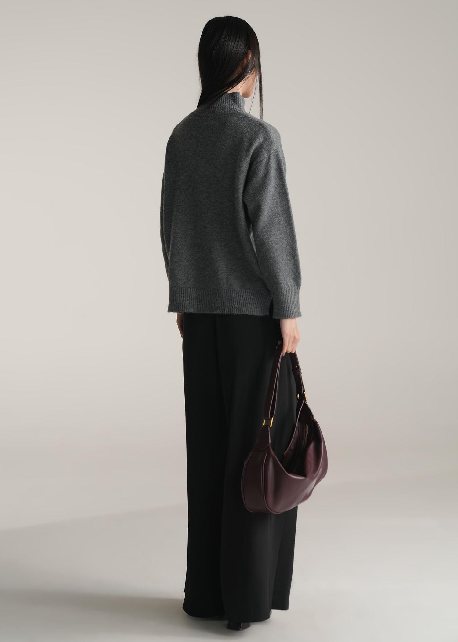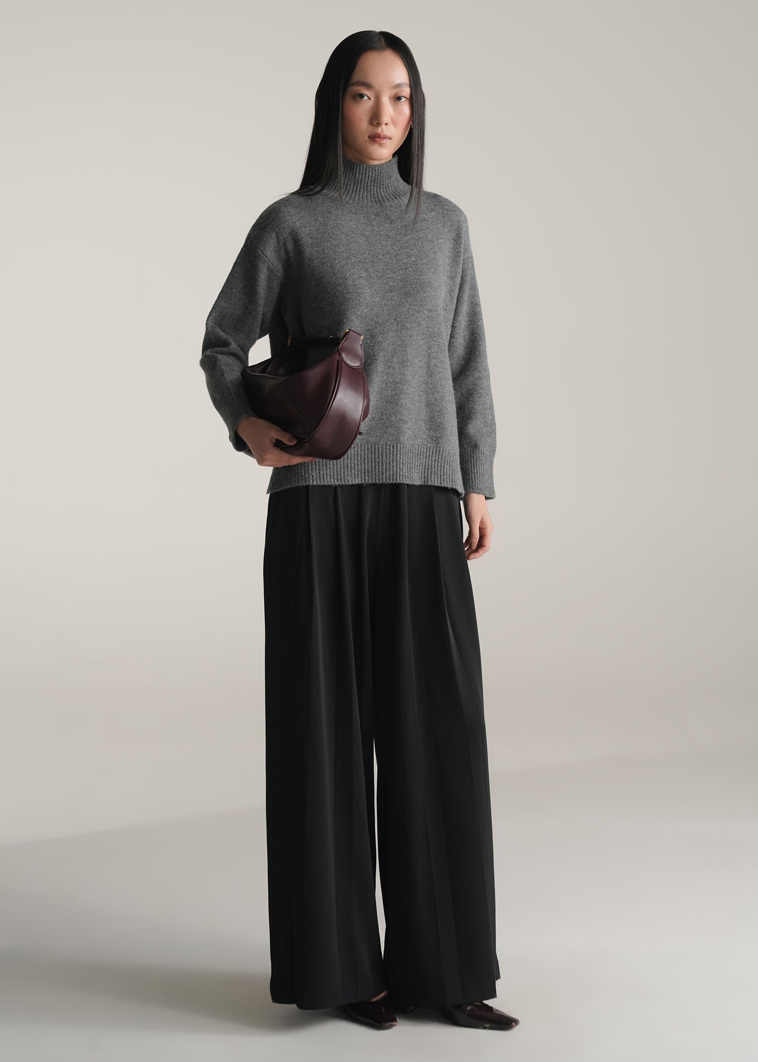 Relaxed fit long sweater with high neck, full sleeves and side slits