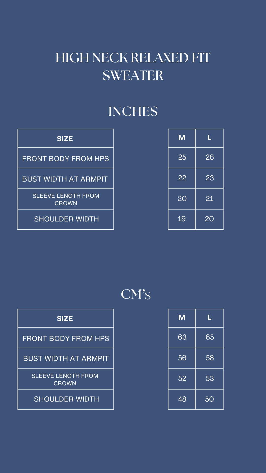 Relaxed fit long sweater with high neck, full sleeves and side slits