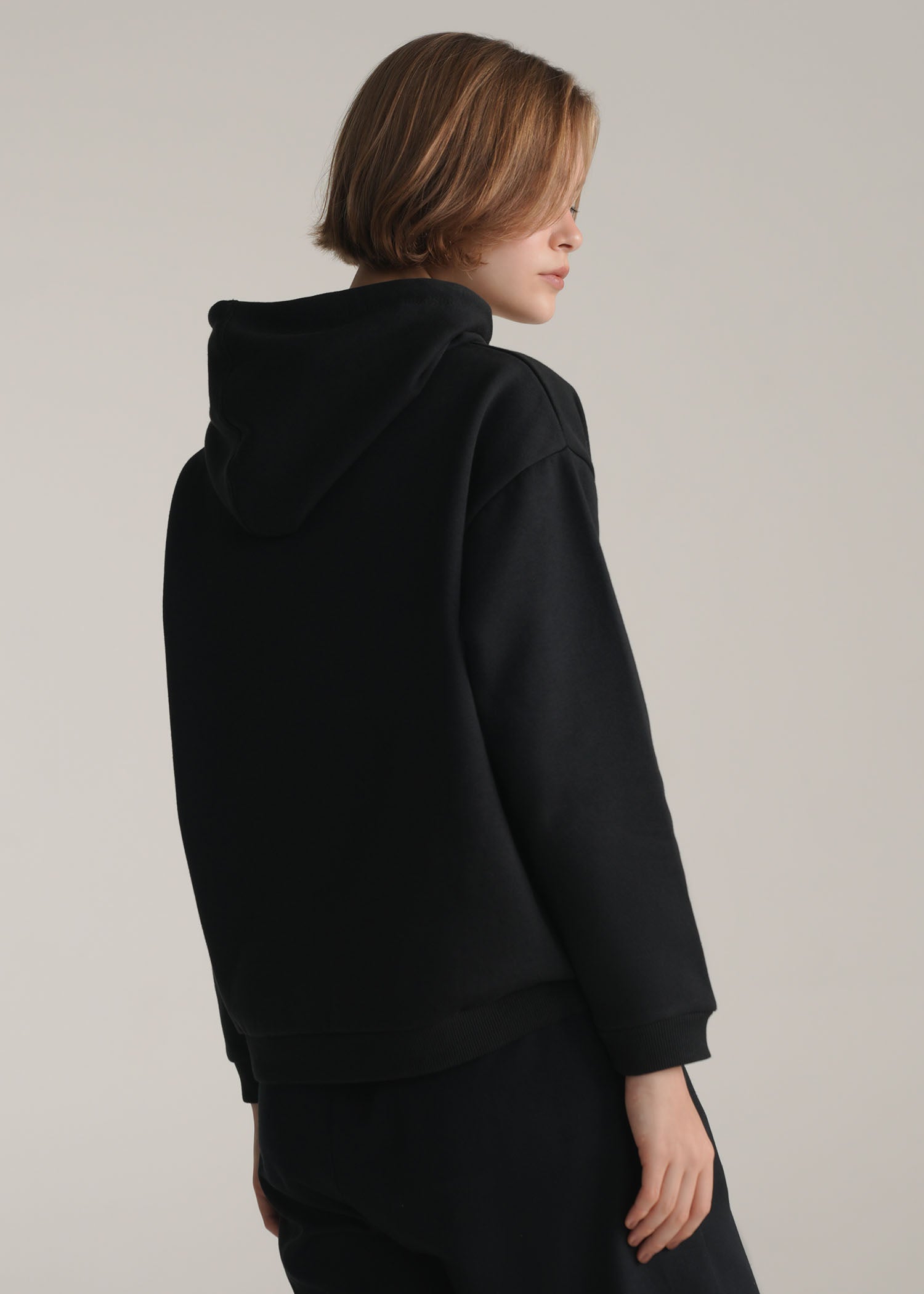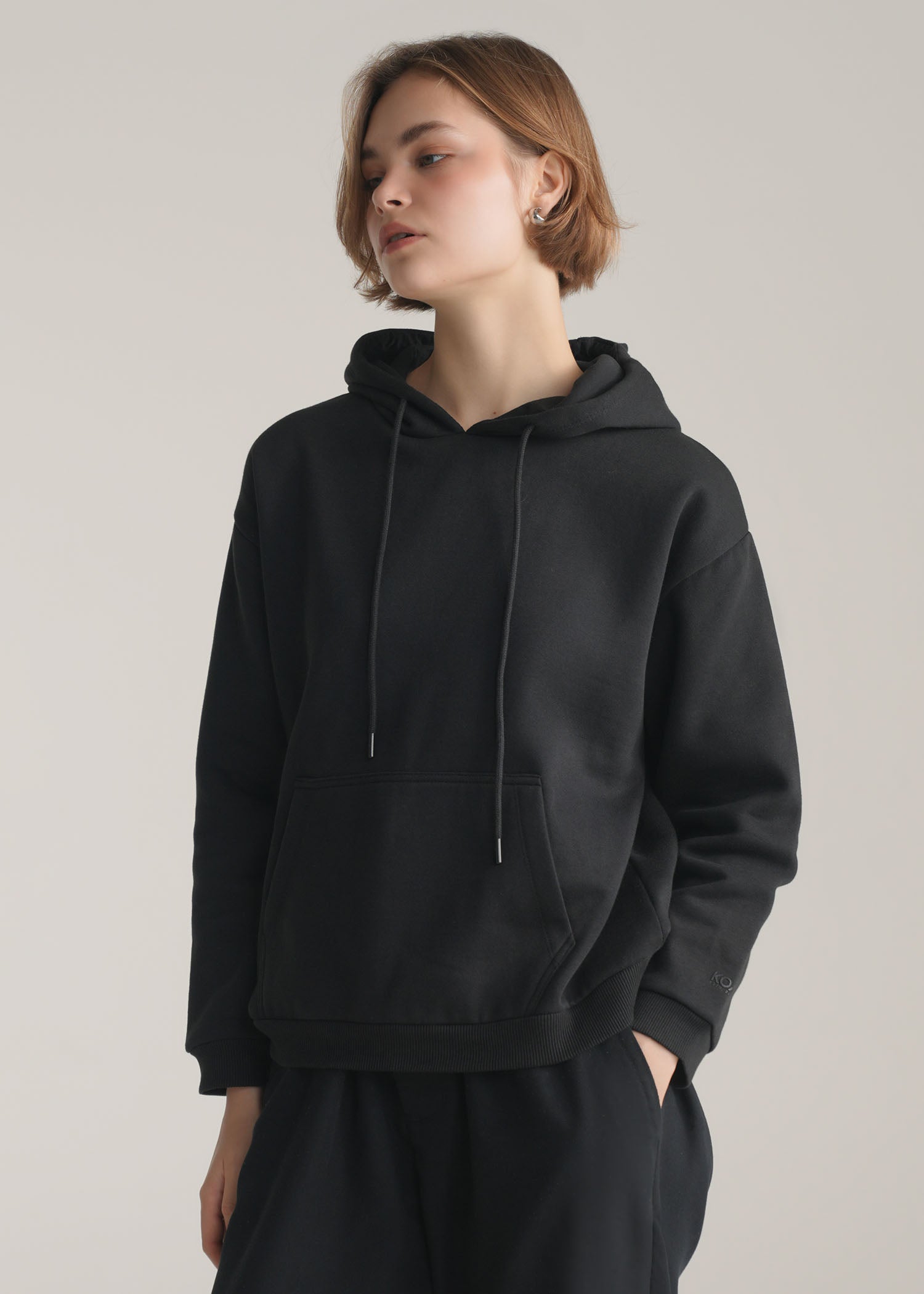 Loose Fit Fleece hoodie with kangaroo pocket, drop shoulder and long sleeves with ribbed cuffs and hem. It comes with adjustable draw cord at neck