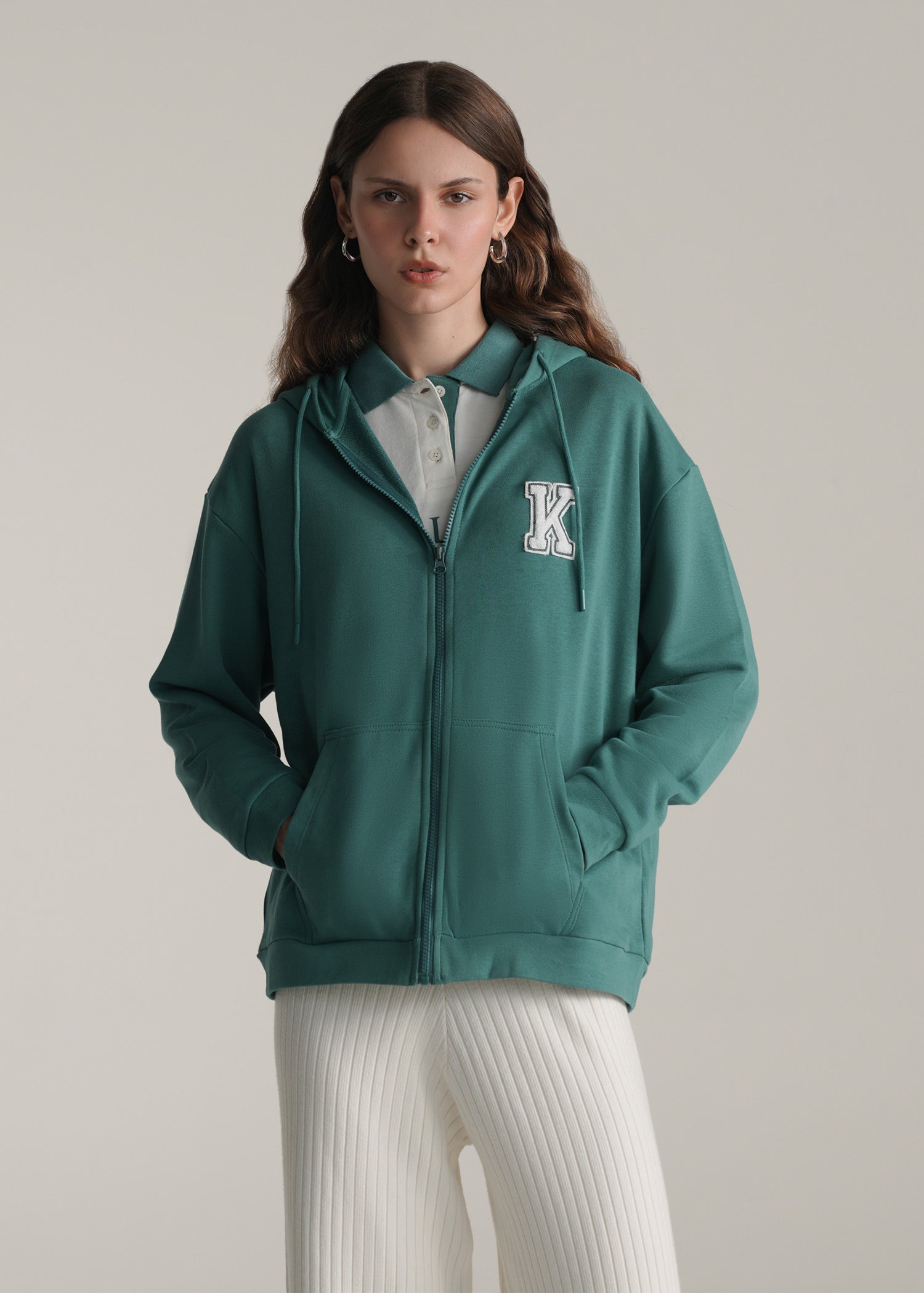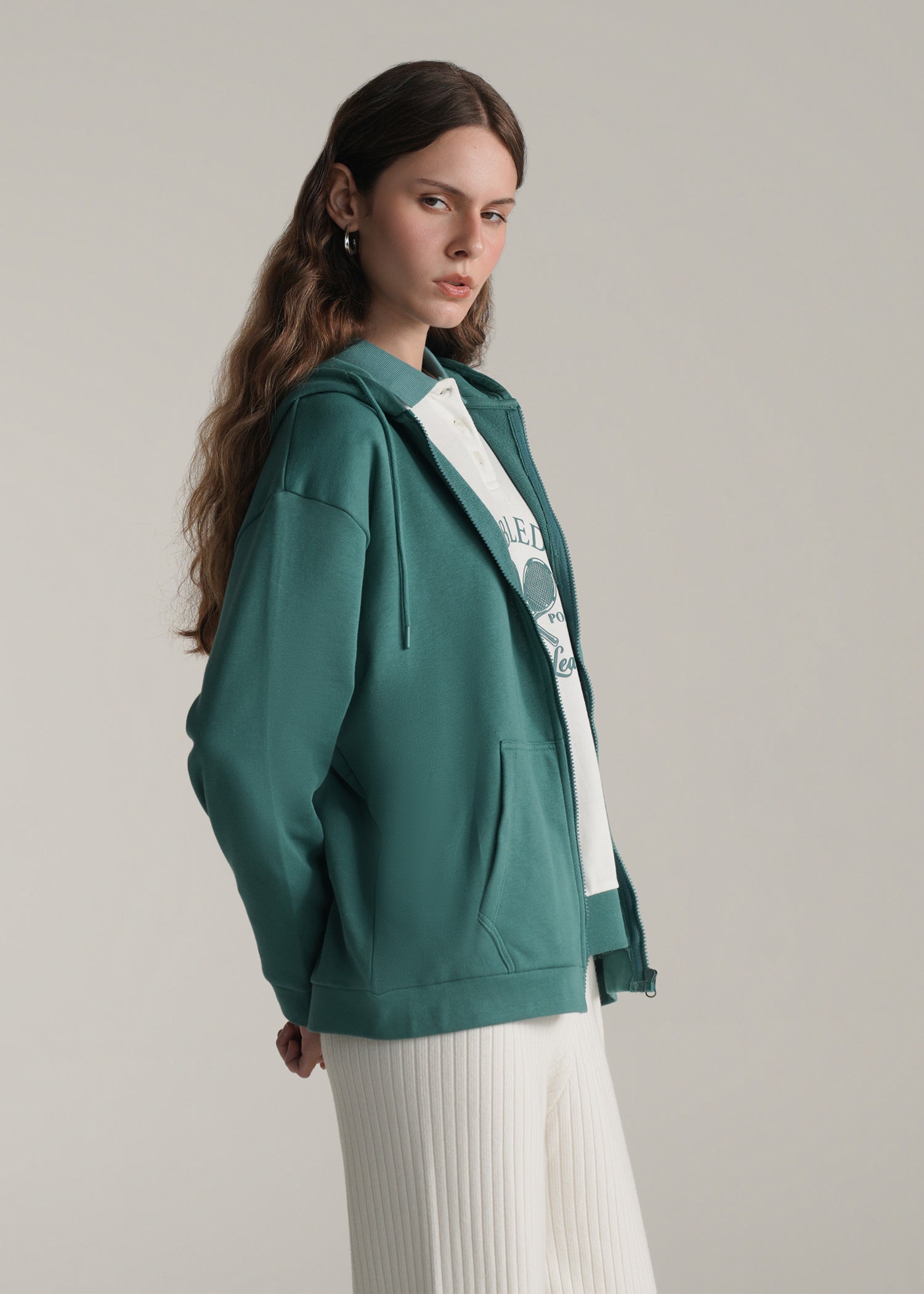 Oversized hoodie with long sleeves and kangaroo pocket. It has front zip closure and draw cords. Has graphic artwork on the front