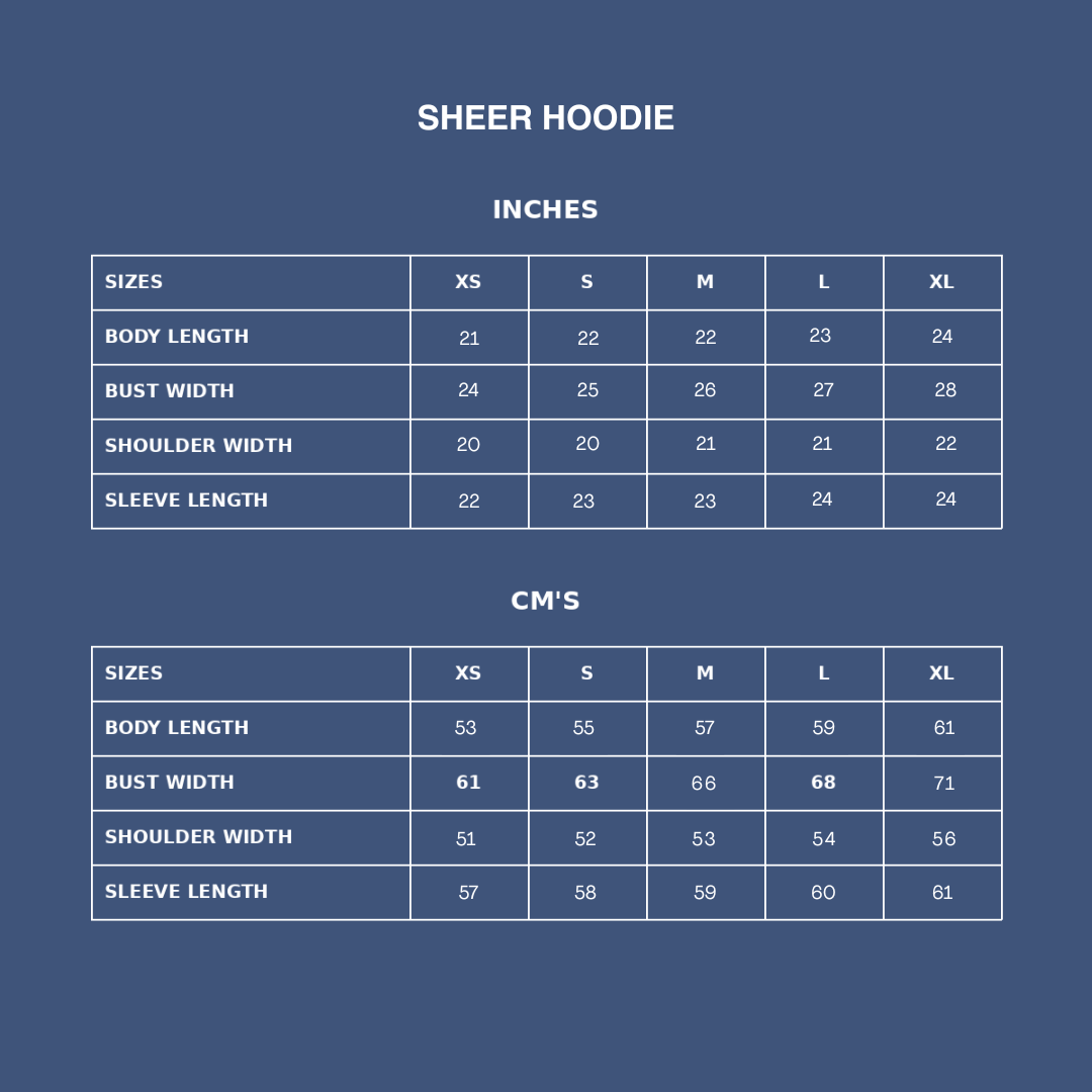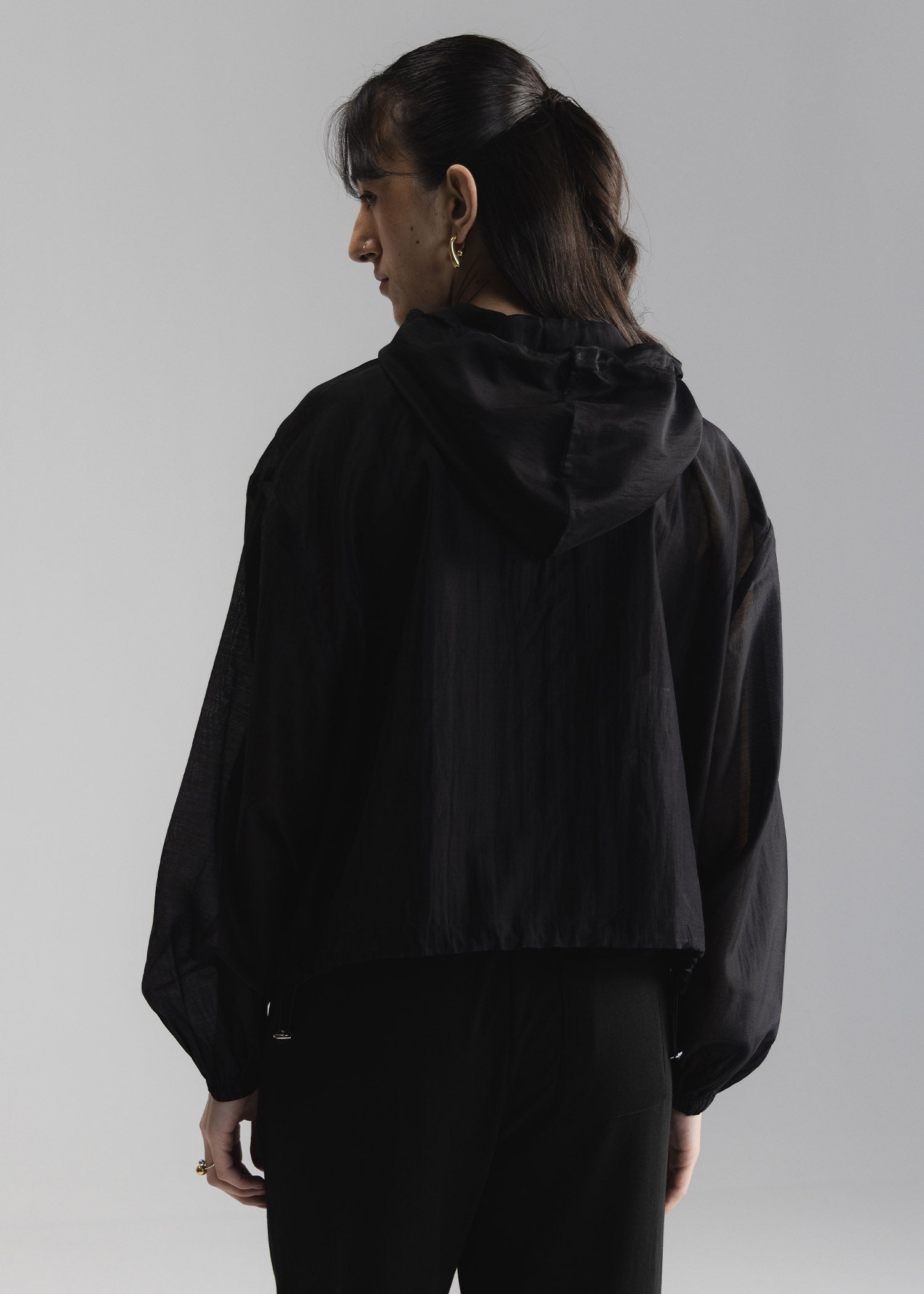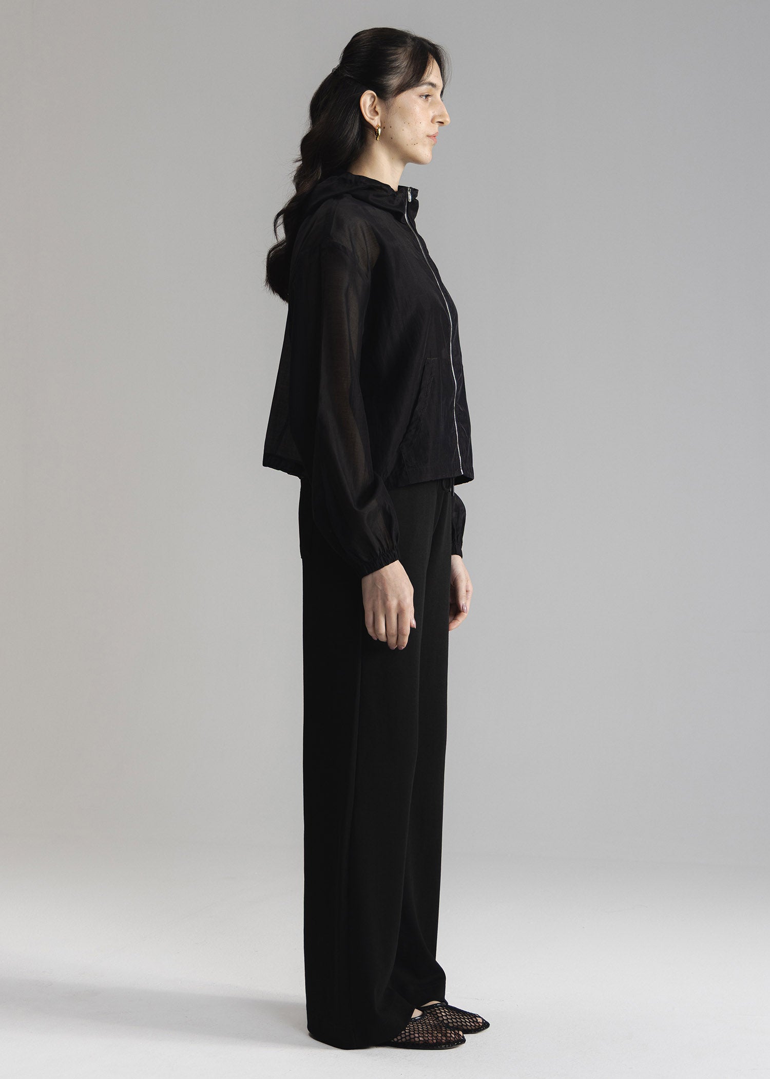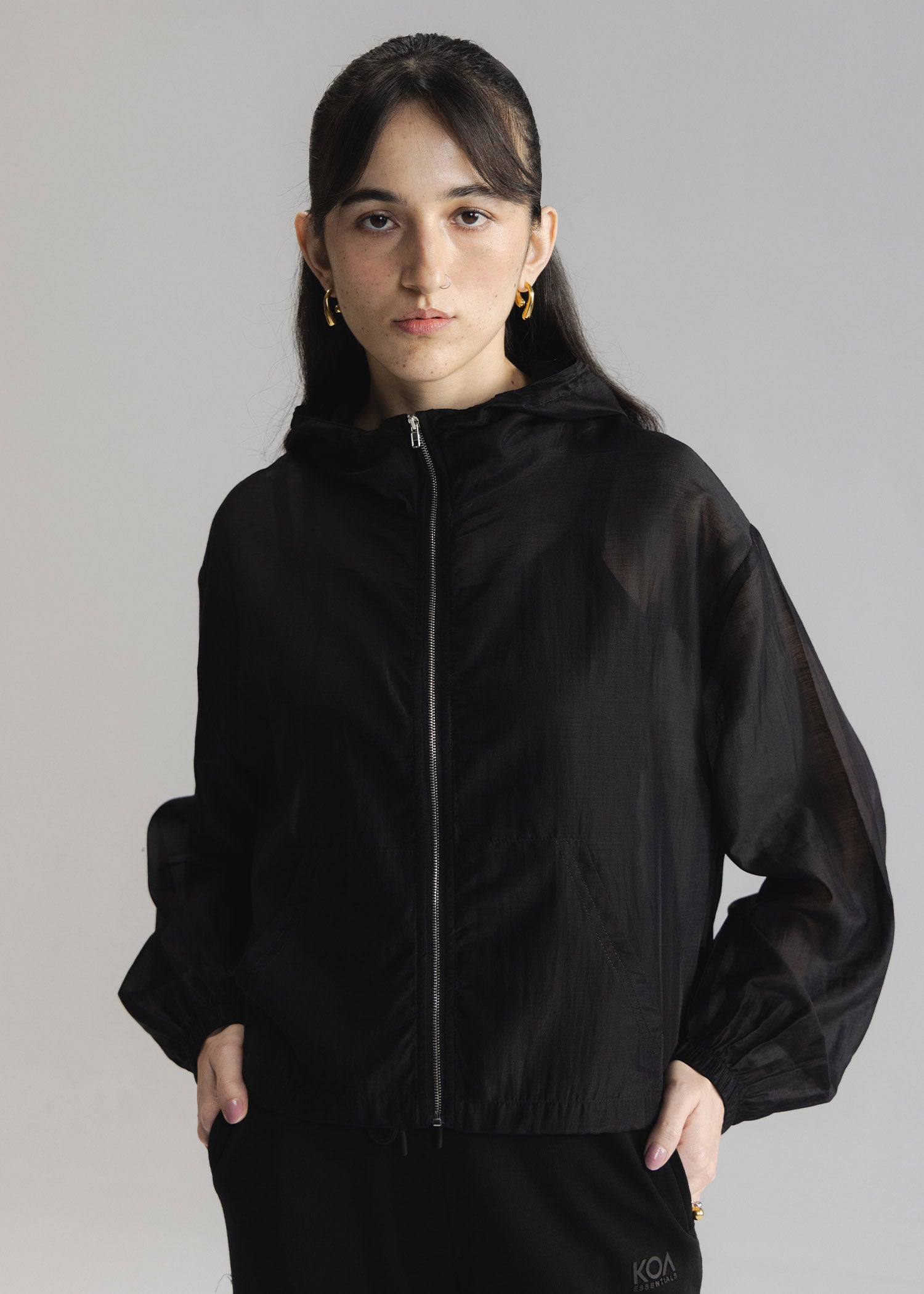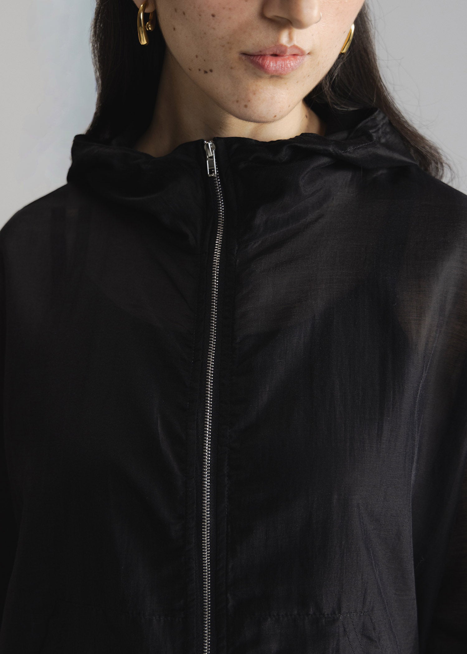 Hoodie in sheer fabric with silver zip closure and elastic draw cords at hem. Includes front pockets