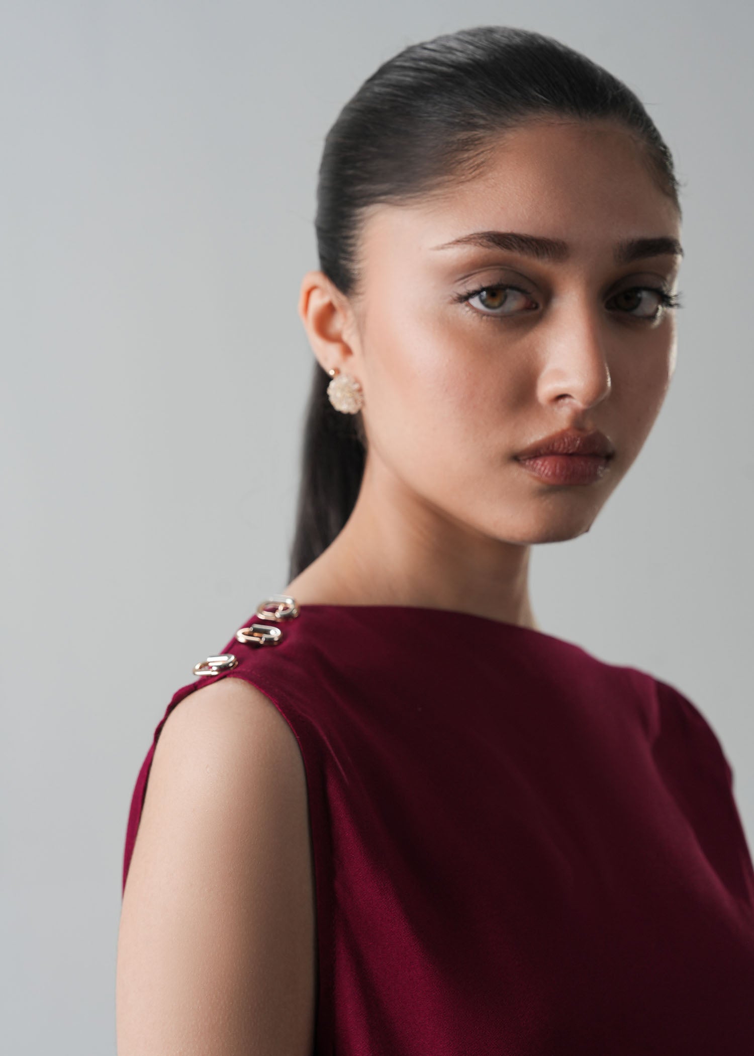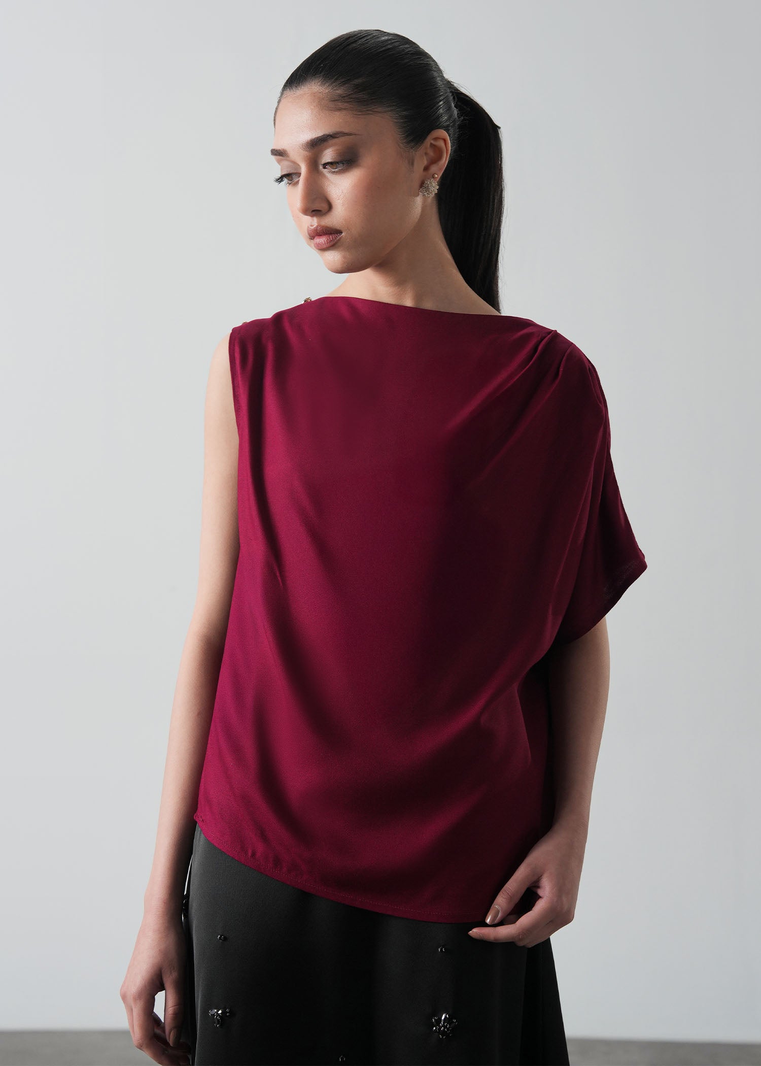 Asymmetric top with shoulder pleat details and metal decorative buttons, boat neckline and Relaxed fit with soft drapes