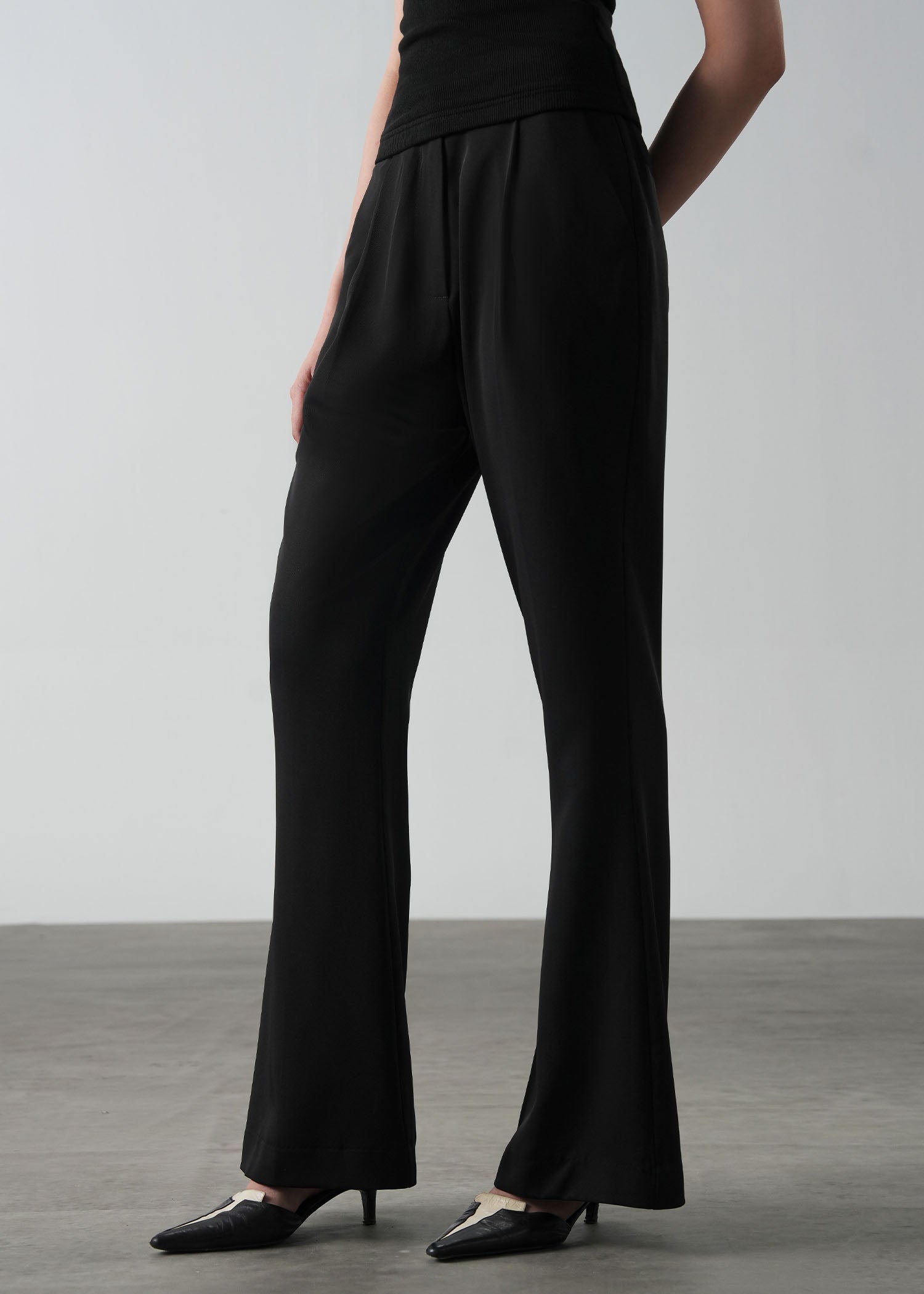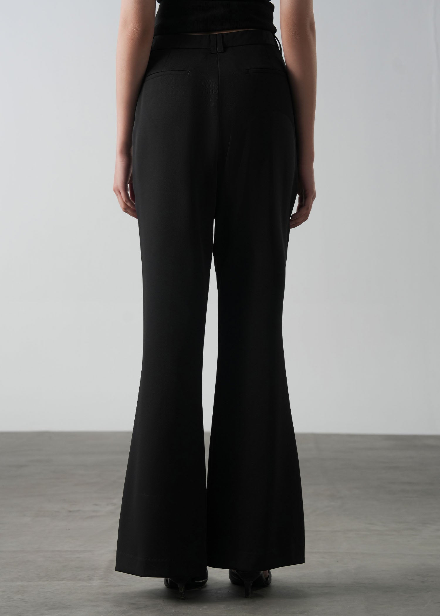 Tailored, high-waisted, flared pant with front pleats. Has side pockets and belt loops