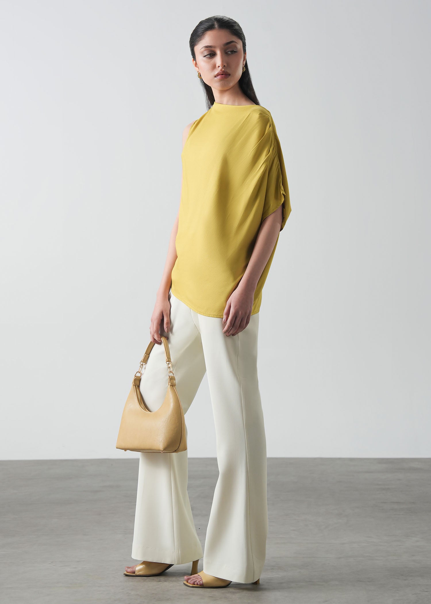 Asymmetric top with shoulder pleat details and metal decorative buttons, boat neckline and Relaxed fit with soft drapes