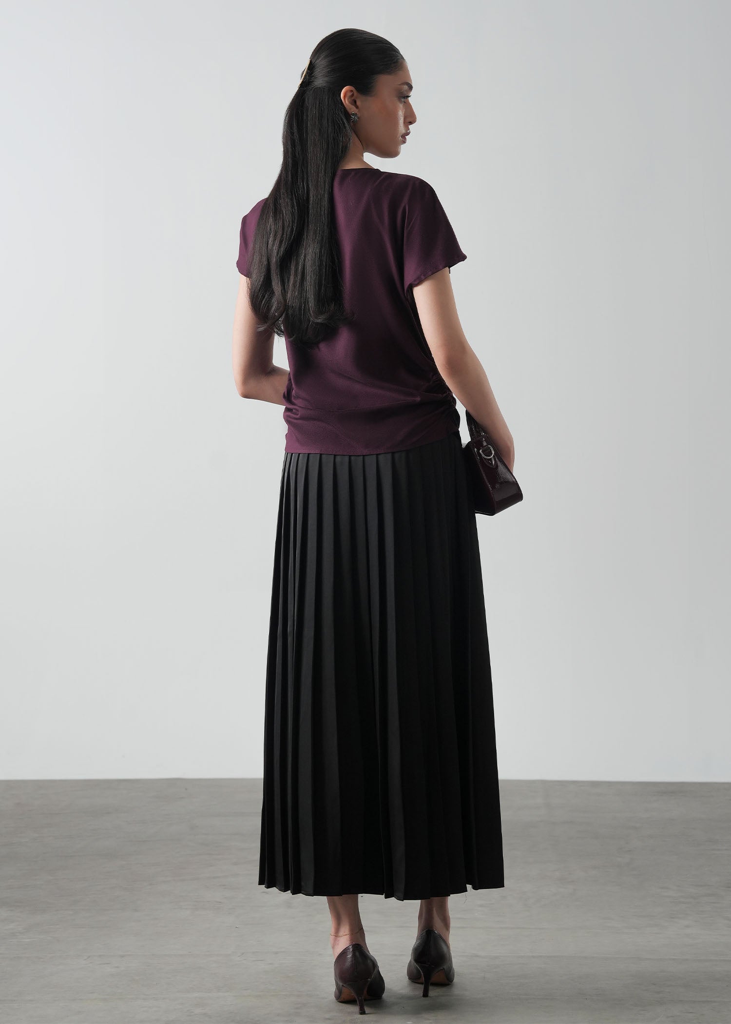 Top with asymmetrical neckline, metal brooch detail and ruching detail at waist. Relaxed fit with a soft drape