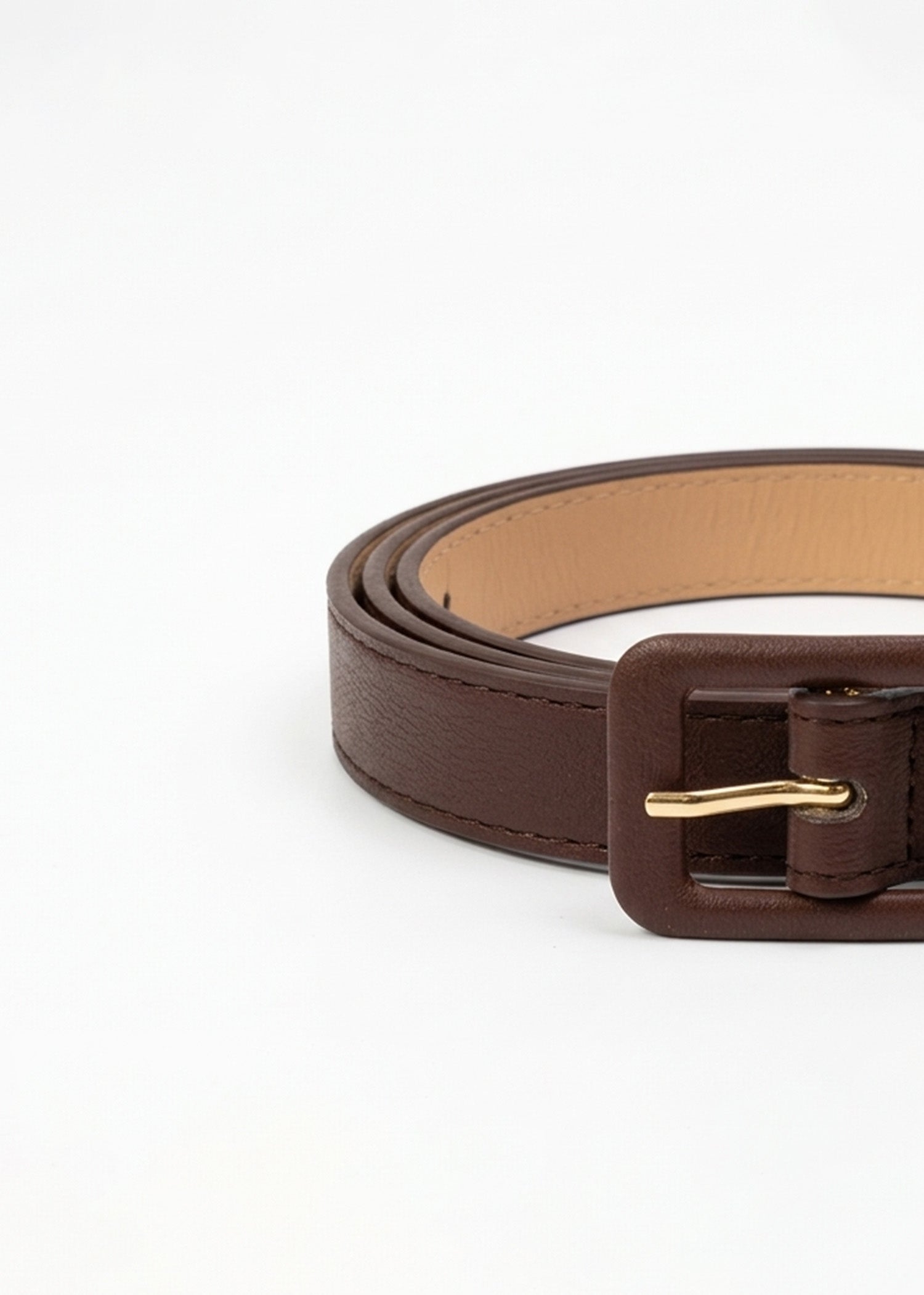 Narrow belt strap with a rectangular coated buckle. Stitched edges provide durability and a clean finish