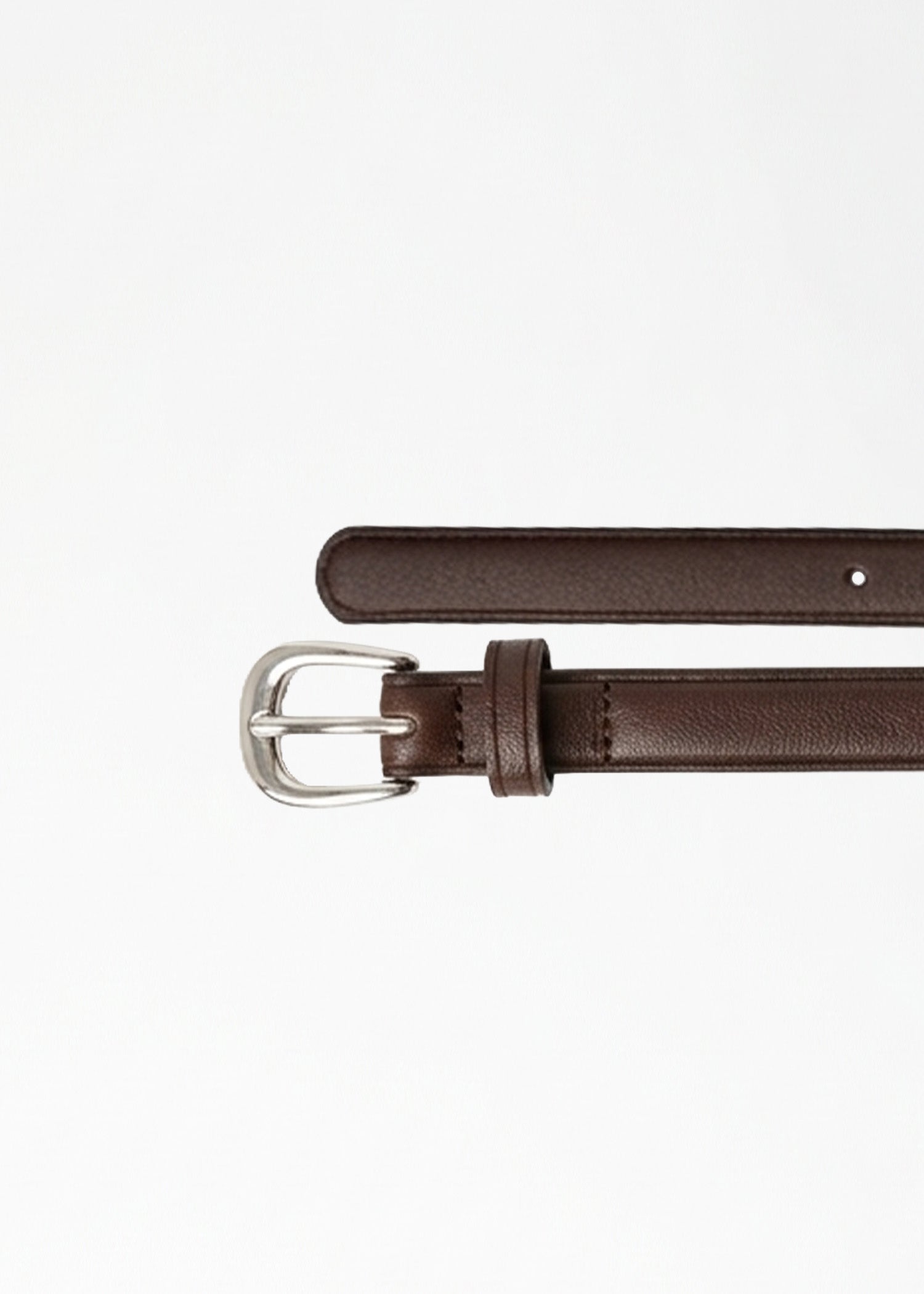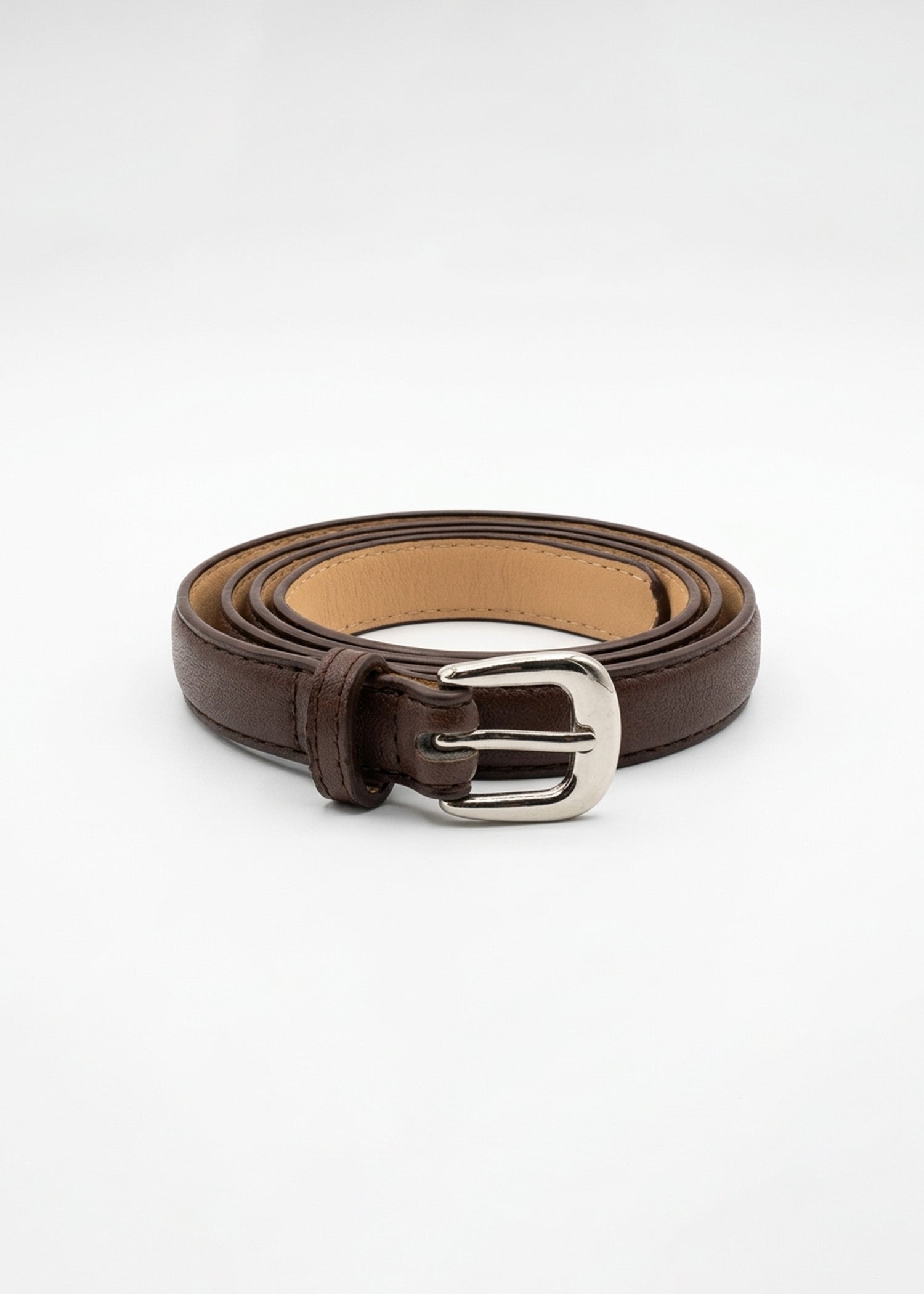 Faux Leather belt with a rectangular silver metal buckle. Stitched edges provide a polished look.