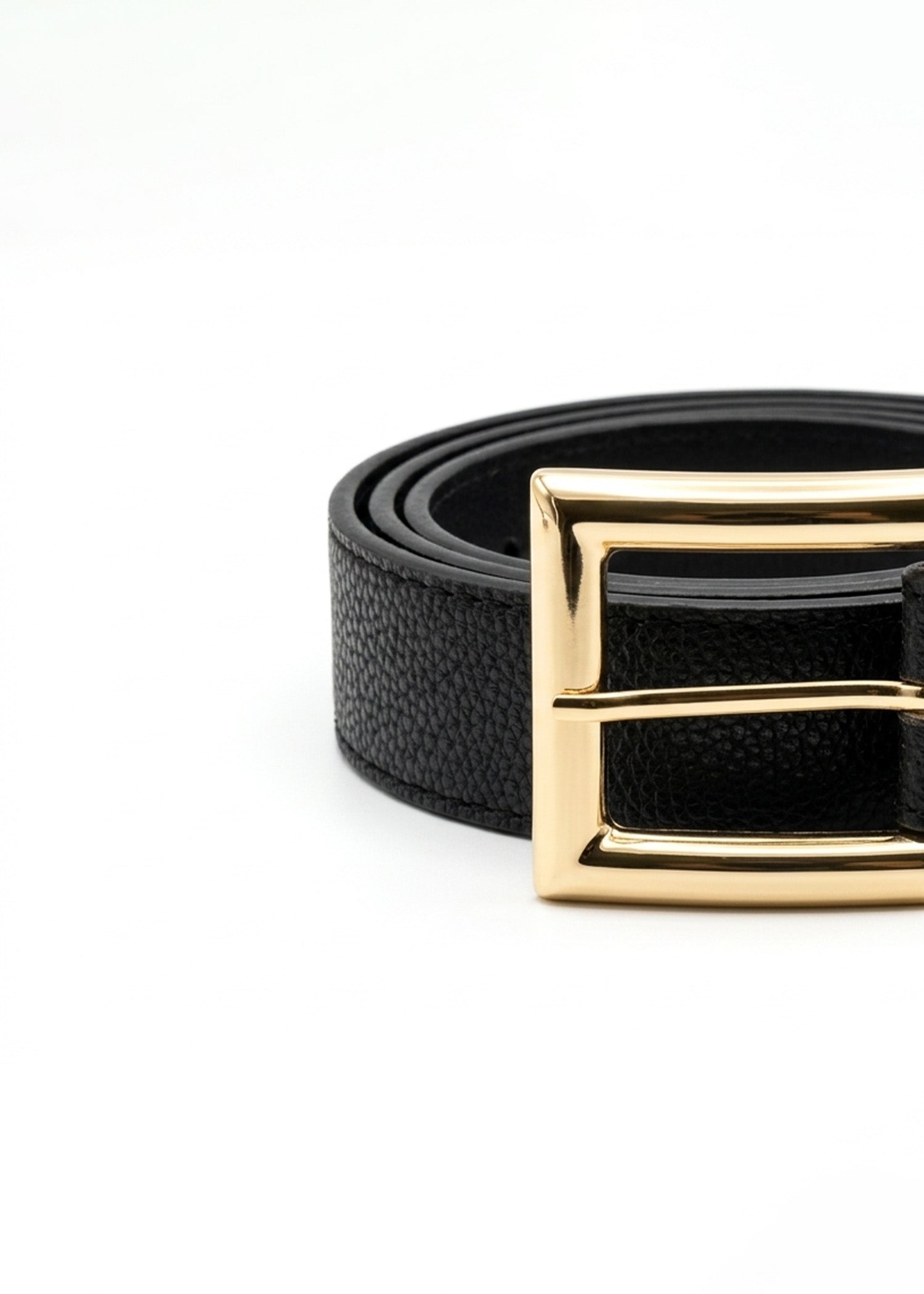 Faux Leather Belt with wide textured strap and a squared gold metal buckle. Stitched edges provide a polished look.