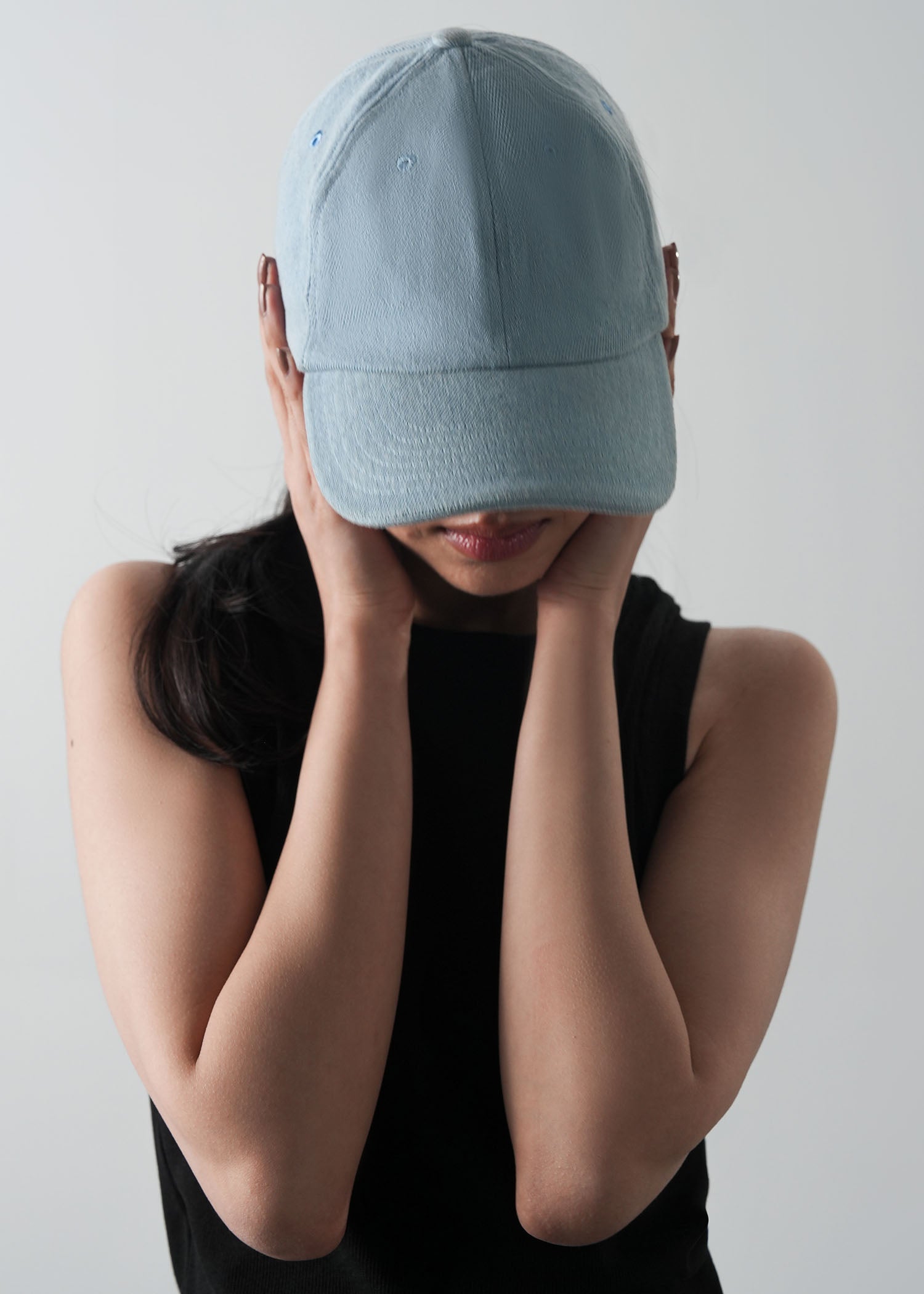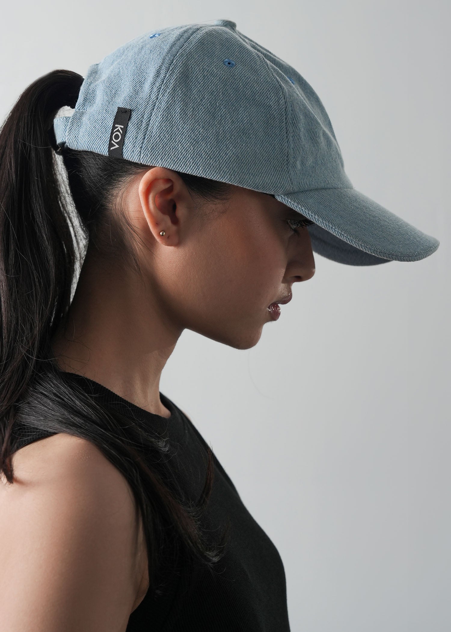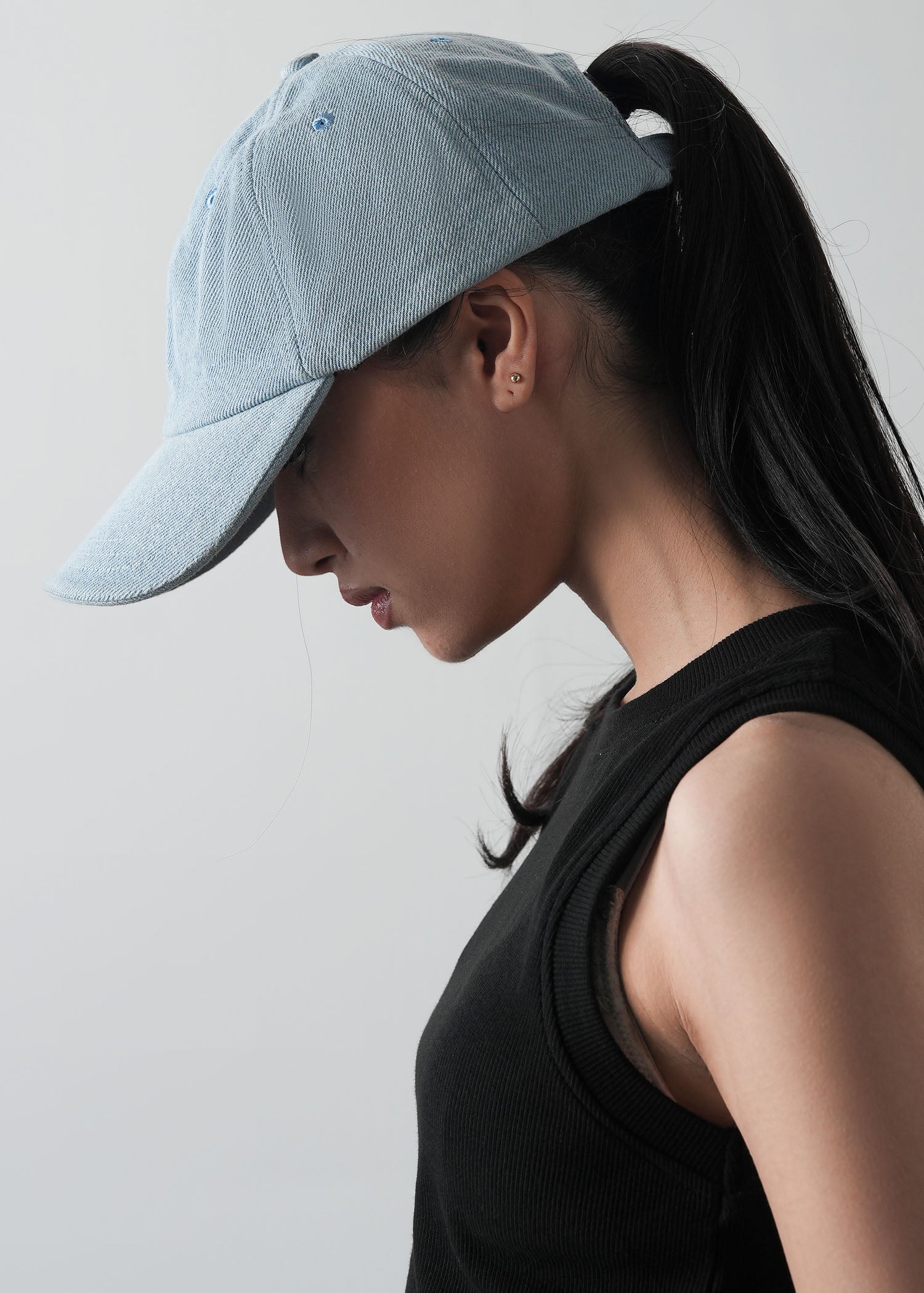 Denim Cap in light blue wash, panels and stitching details. Silver metal buckle at back with branding label