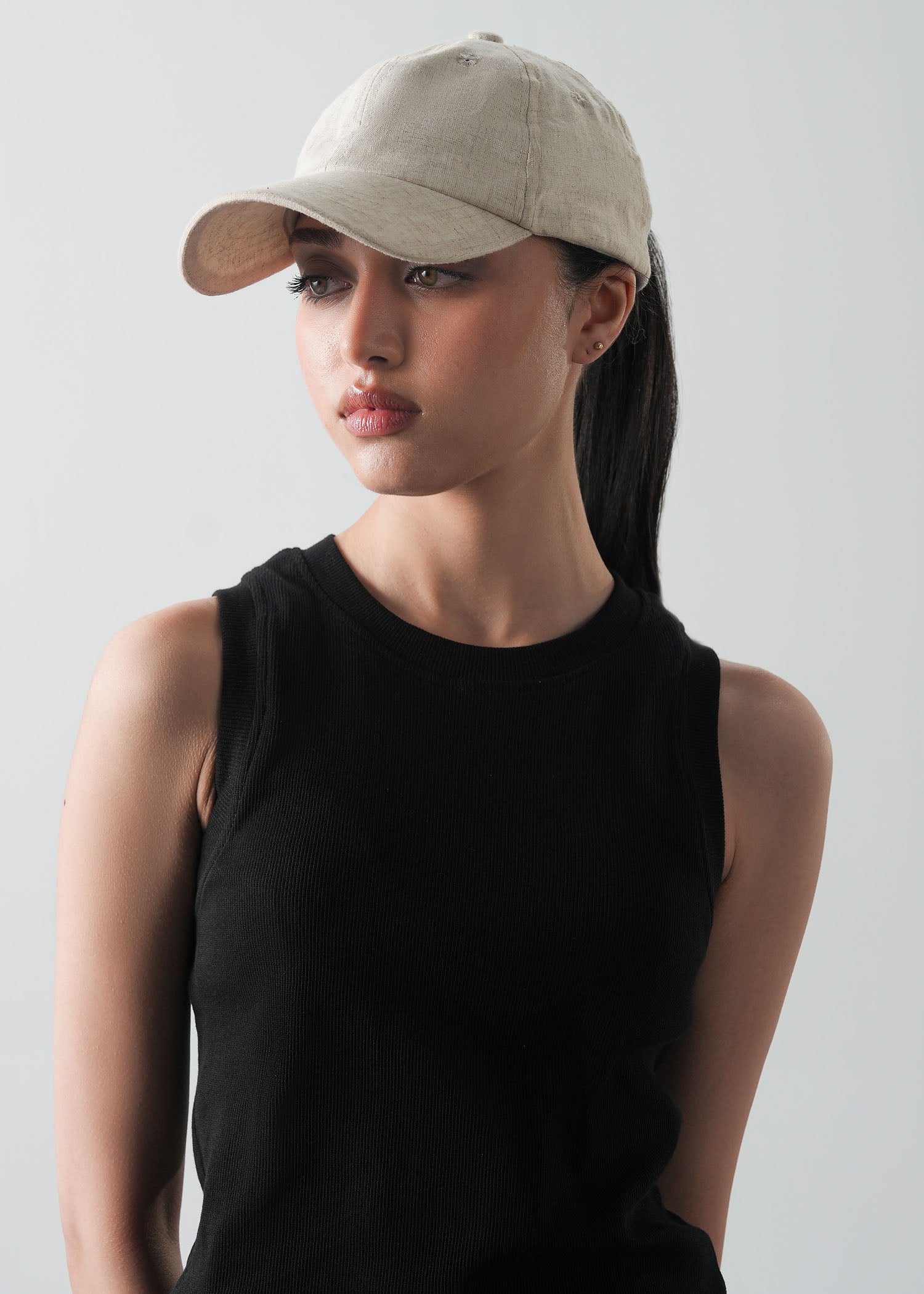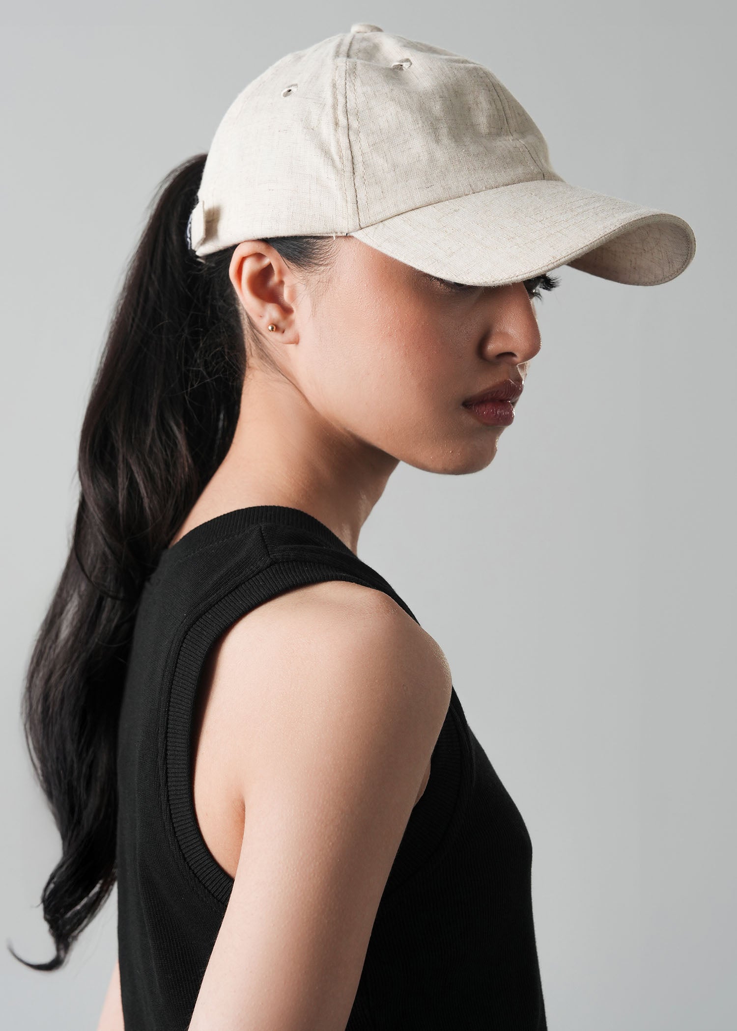 Linen Cap with panels and stitching details. Silver metal buckle at back with branding label
