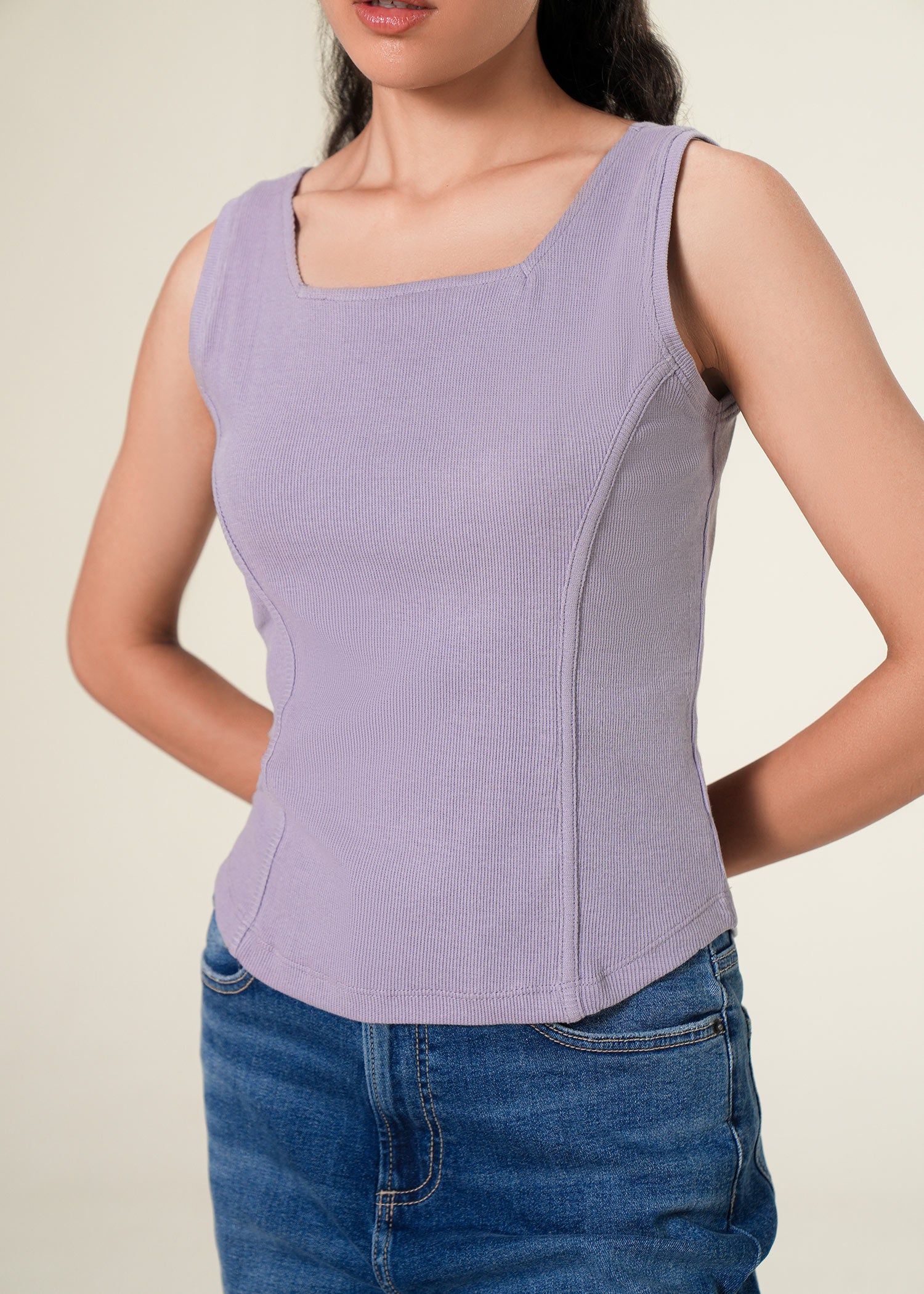 Sleeveless tank top with a round neckline. Horizontal stripe pattern throughout with a straight hem.