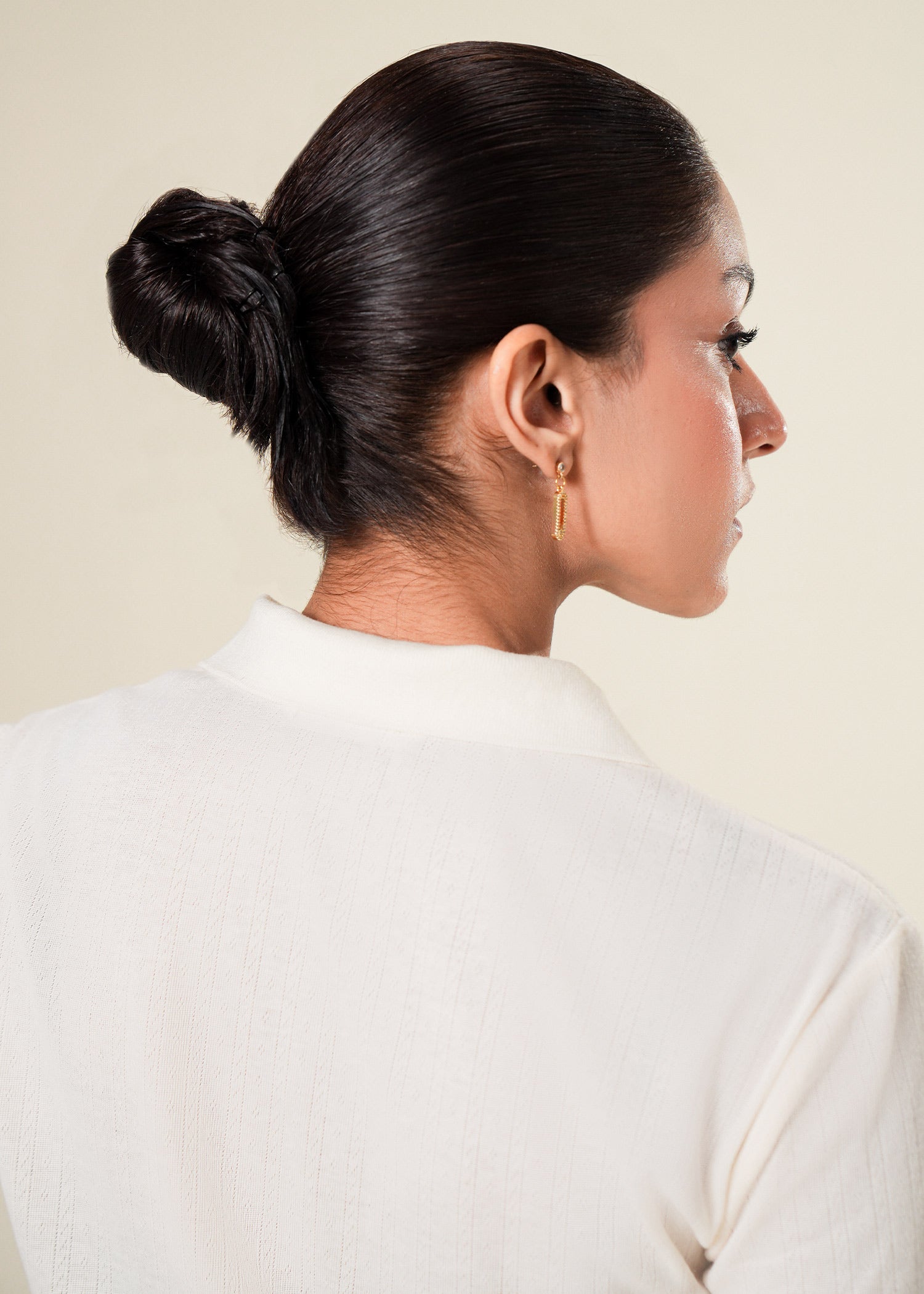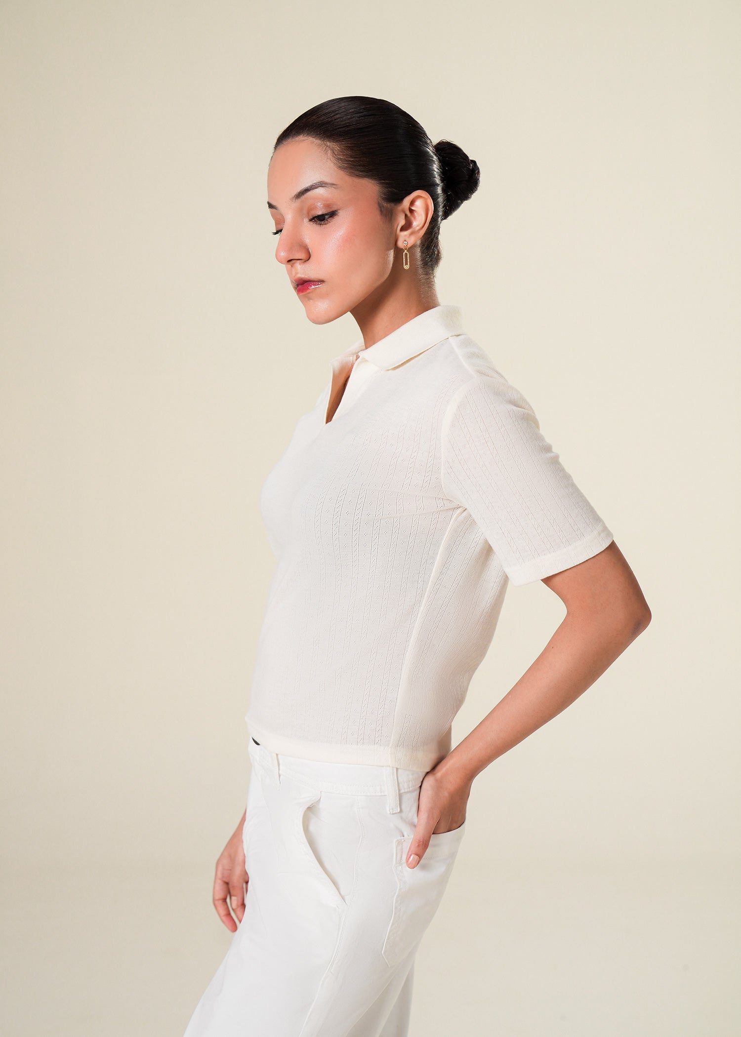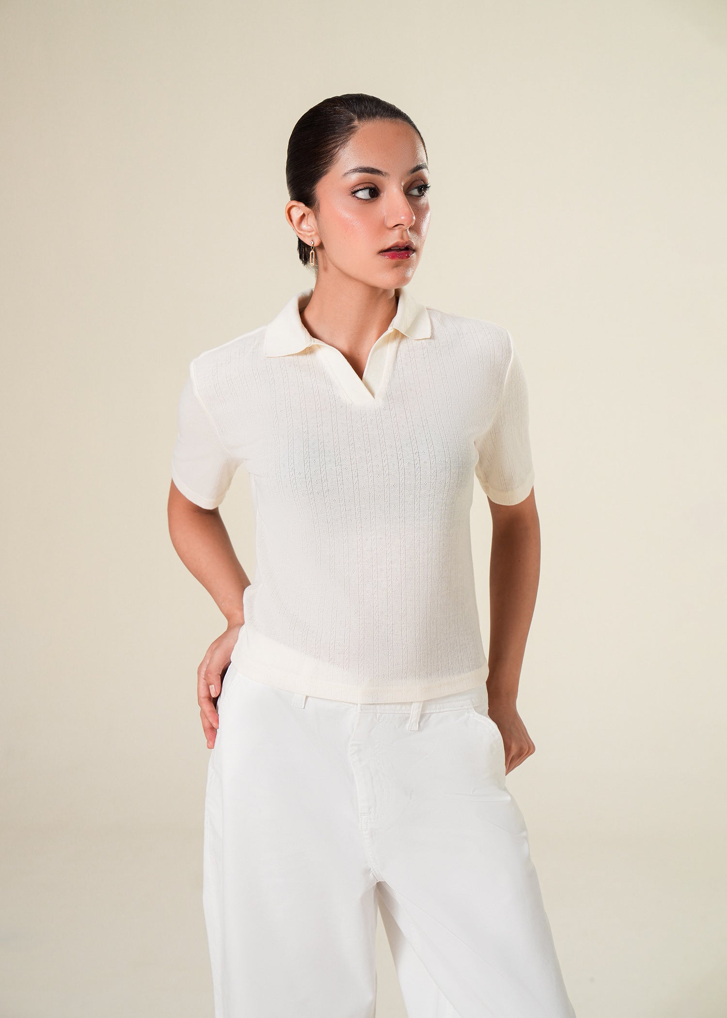 Knitted polo shirt with pointelle detail. Half sleeves and collar with front V-placket
