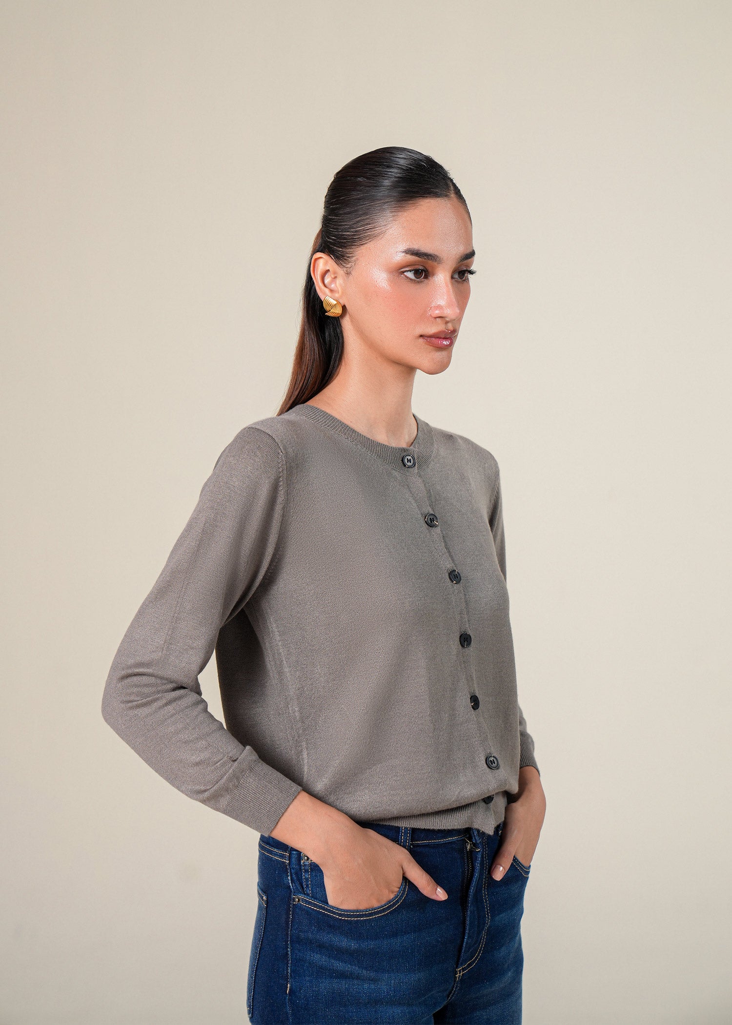 Knitted relaxed fit cardigan with crew neck and long sleeves.