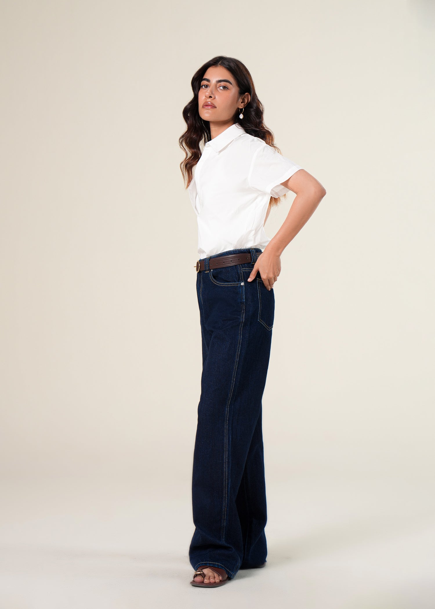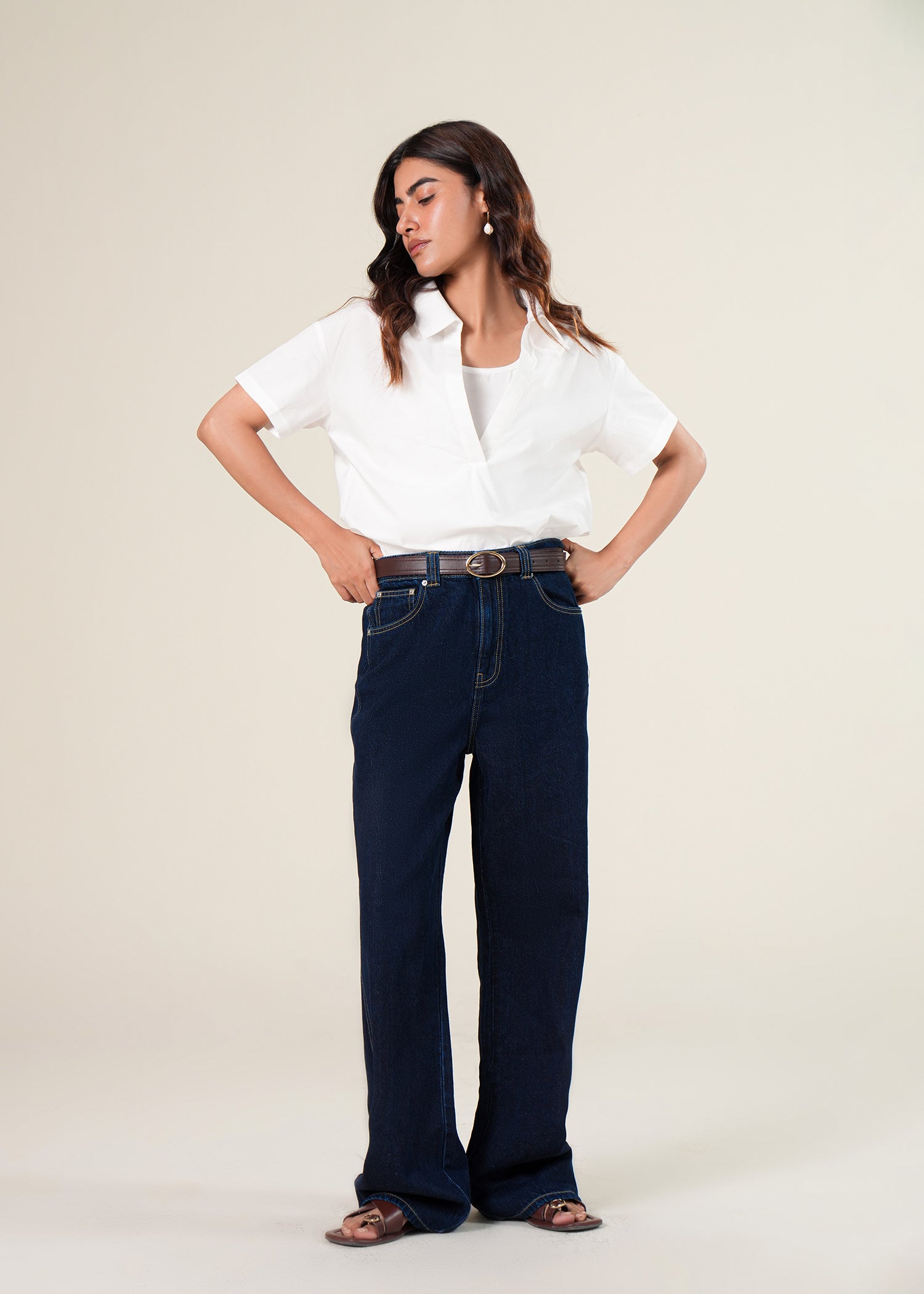 Double layered bodysuit. A classic collar with front V-placket and blousing on top layer. Fitted scooped neck knitted top on bottom layer