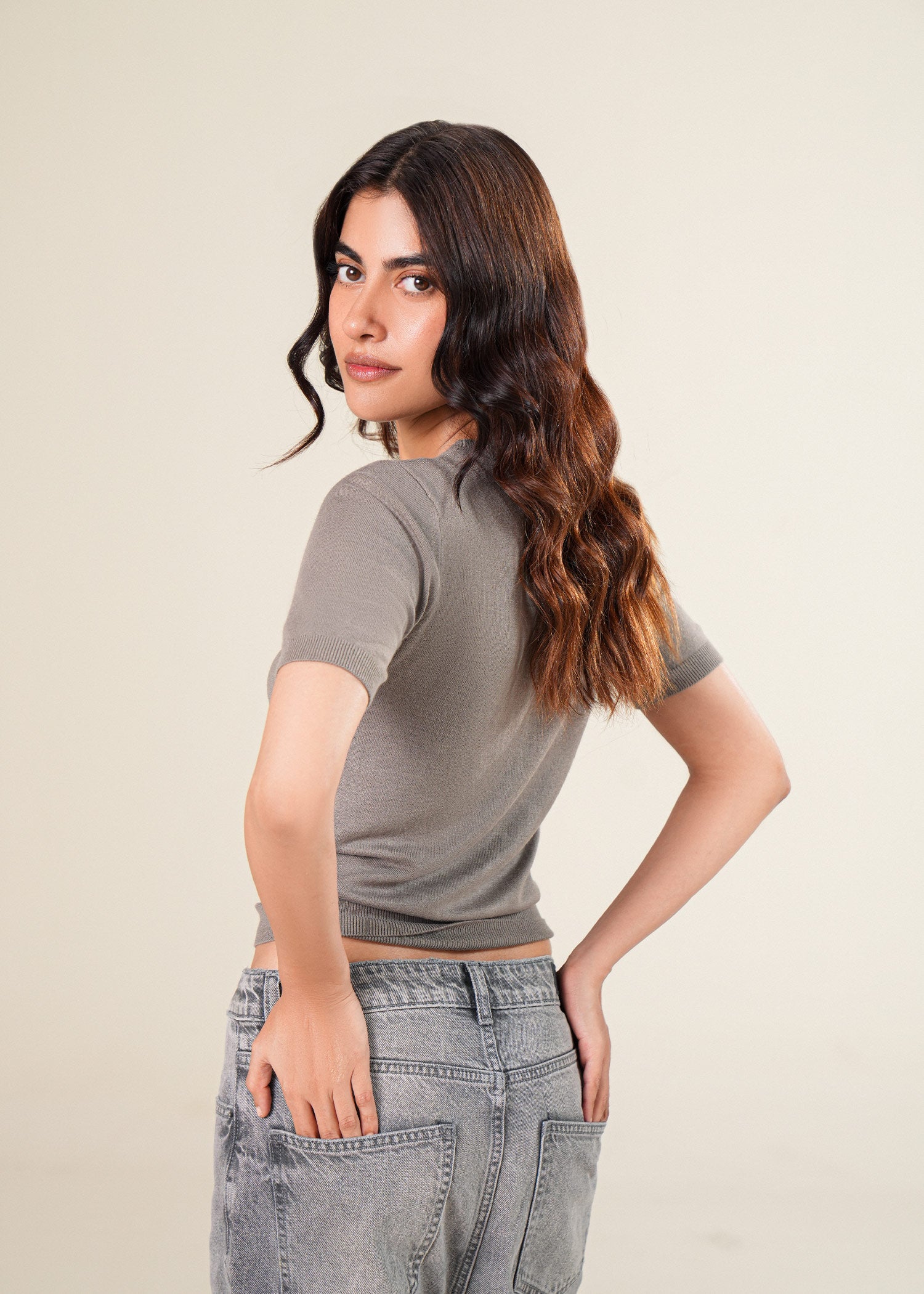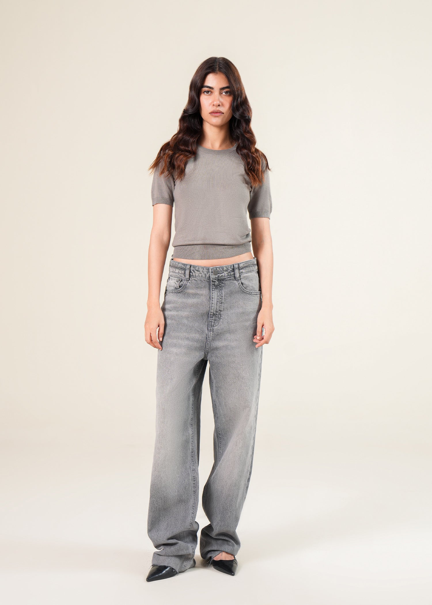 Knitted relaxed fit cardigan with crew neck and long sleeves.