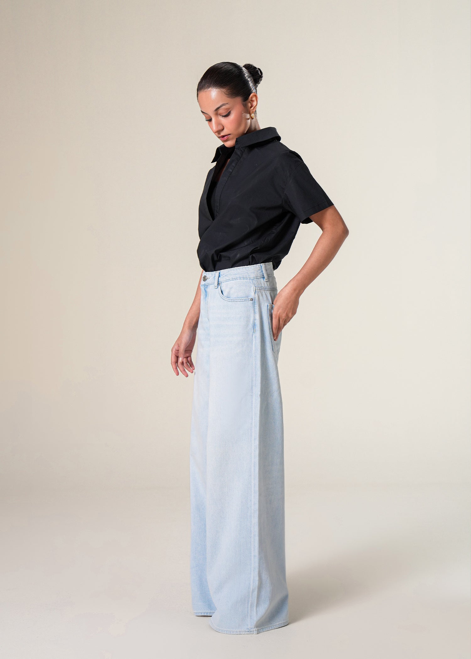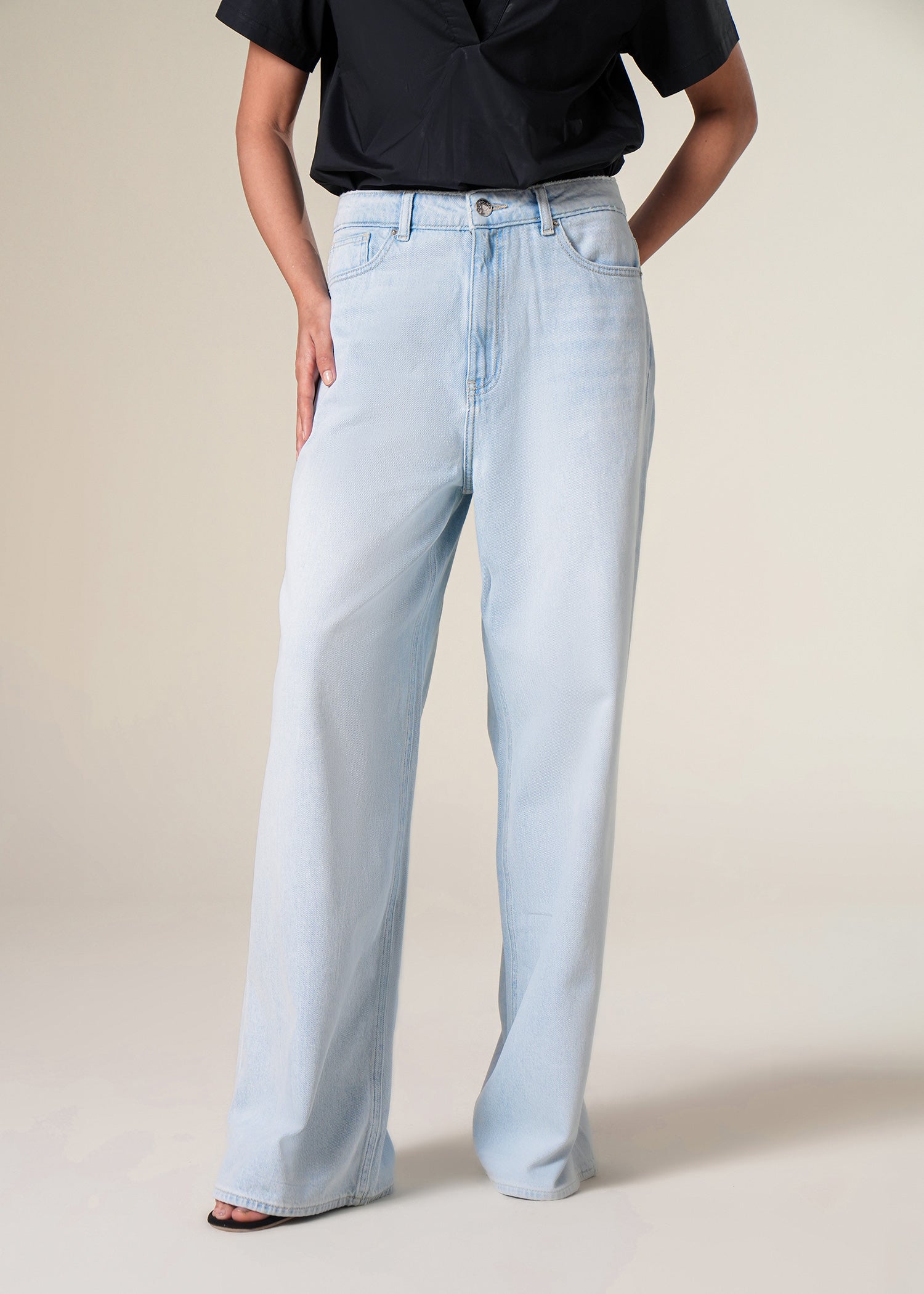 Bleached blue wide legged jeans with high waist and pockets at sides and back