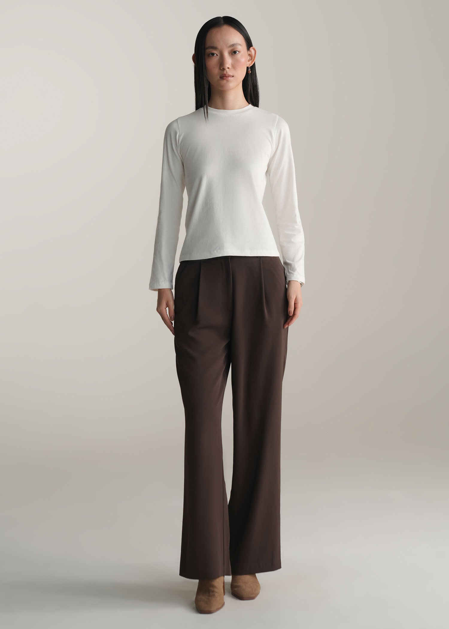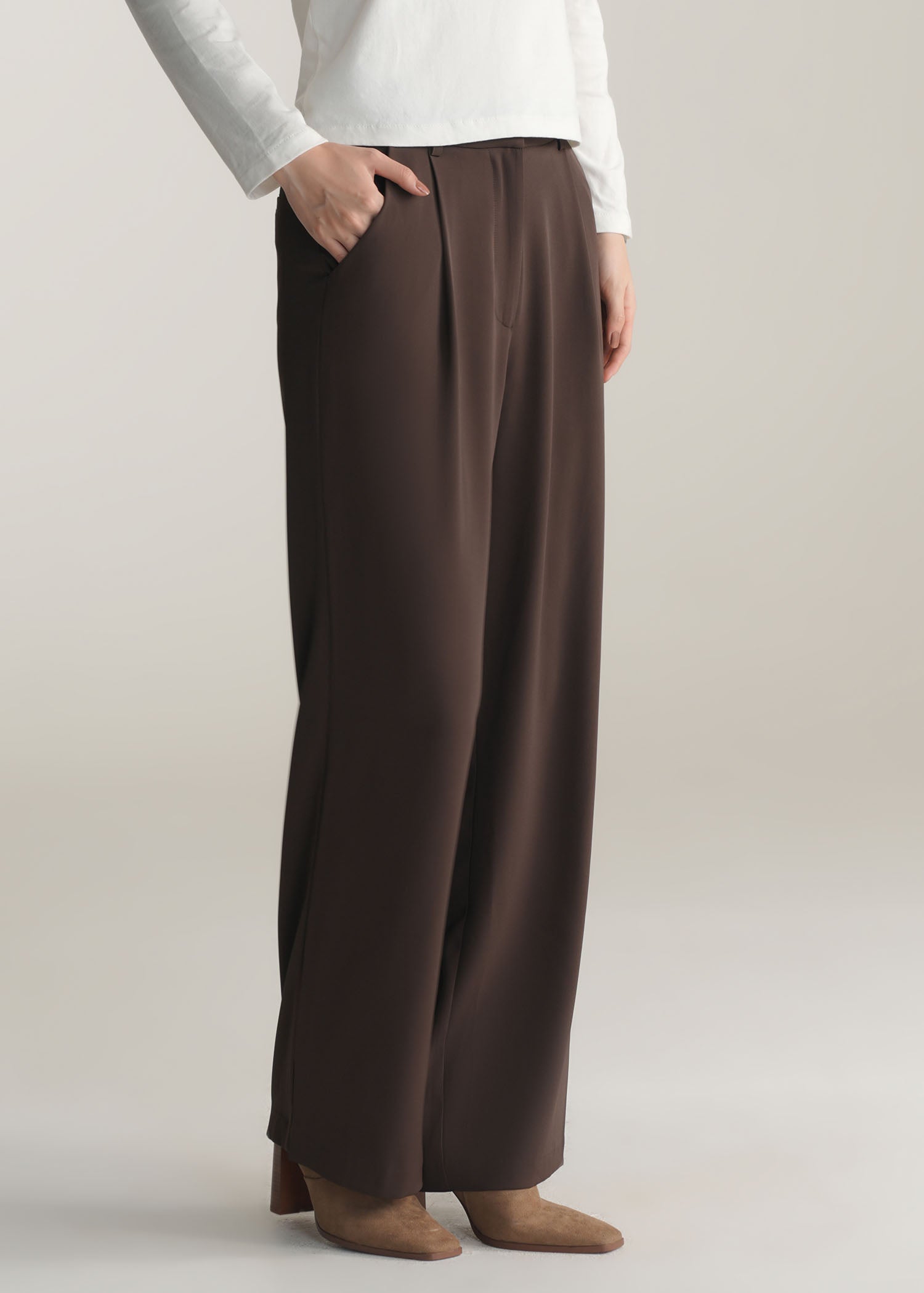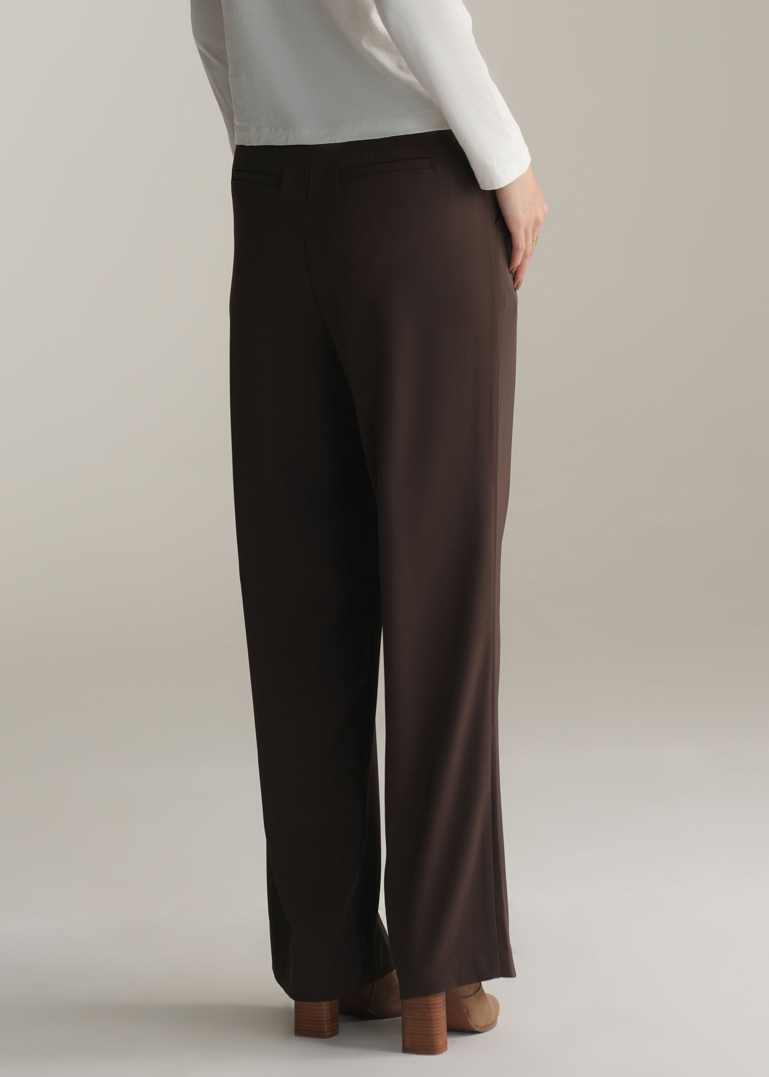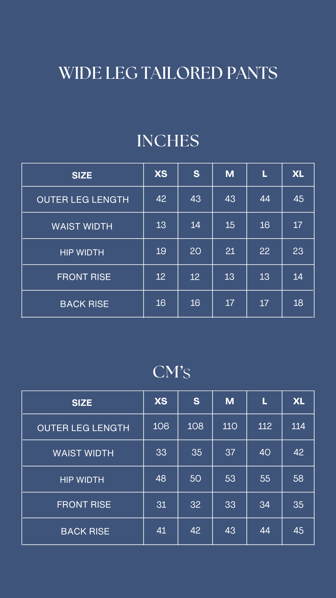 Wide Leg Tailored pants with front pleats, front fly closure and side pockets. It has back welt pockets and dart