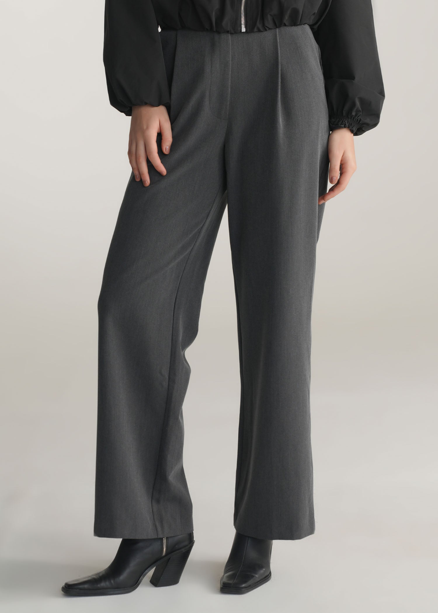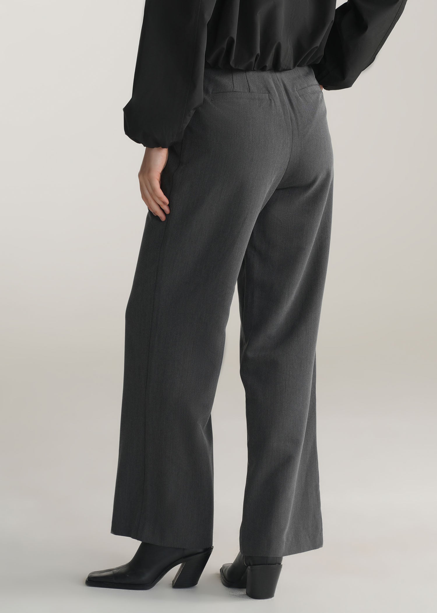 Wide Leg Tailored pants with front pleats, front fly closure and side pockets. It has back welt pockets and dart