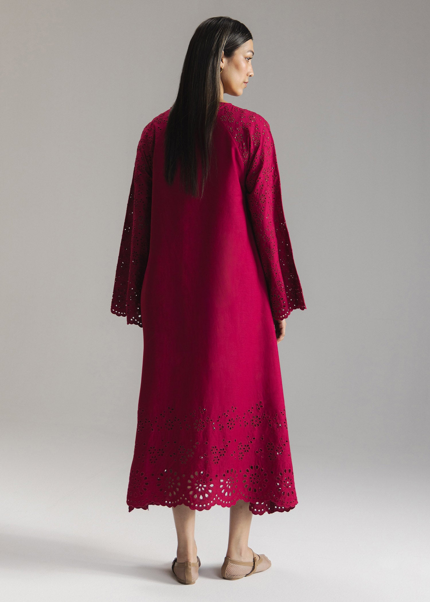 Flared dress with schiffli embroidery raglan sleeves and hem, round neck with v. includes drawstring with beads tassel
